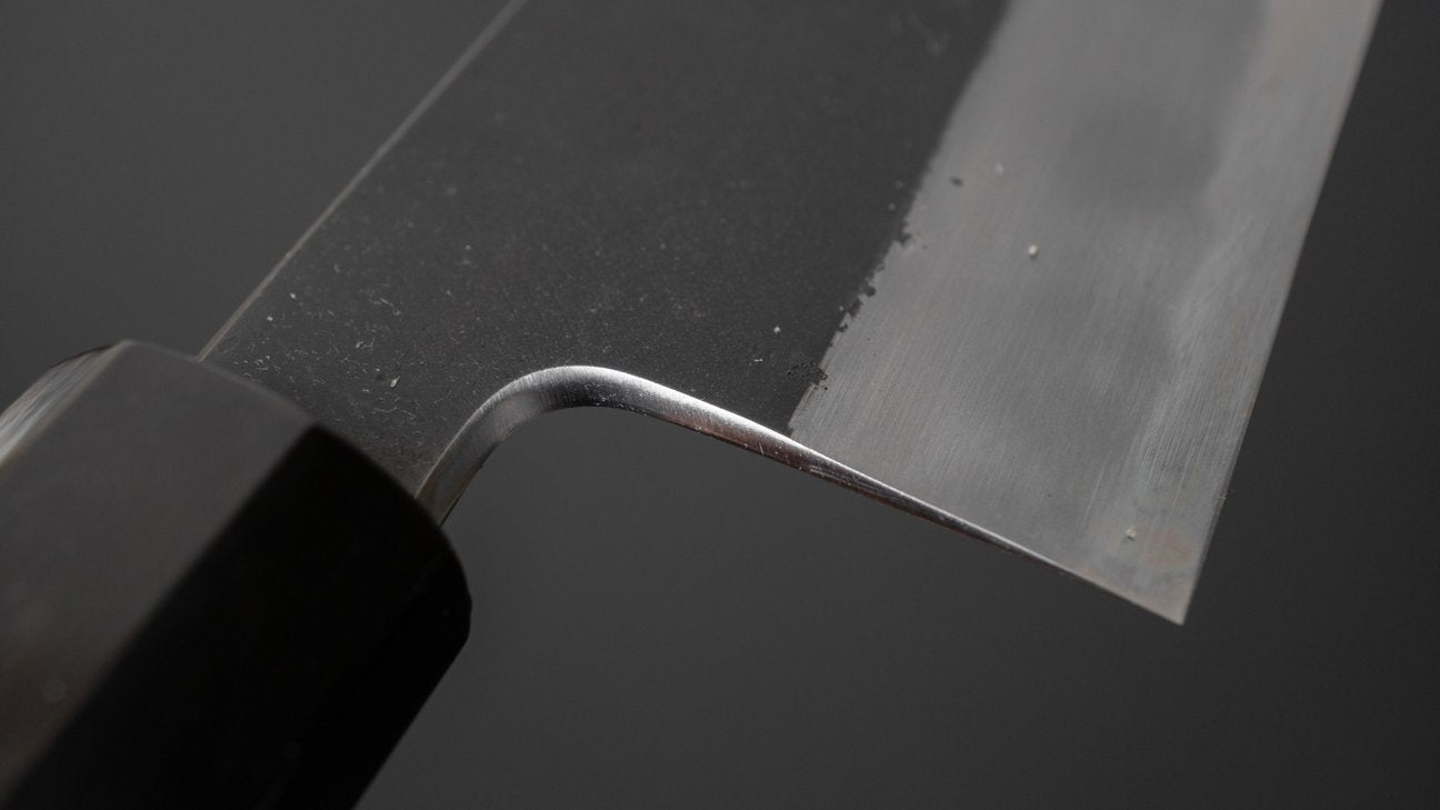 This is a carbon steel knife. Carbon steel is a non-stainless steel that lacks sufficient chromium and/or nickel to protect it from oxidation. As a result, it reacts to moisture and oxygen. While this may sound like a downside, it’s actually a key feature. Carbon steel forms a unique patina over time, is easy to sharpen, and offers excellent edge retention.