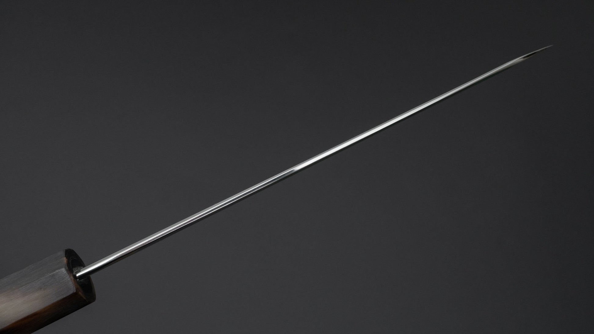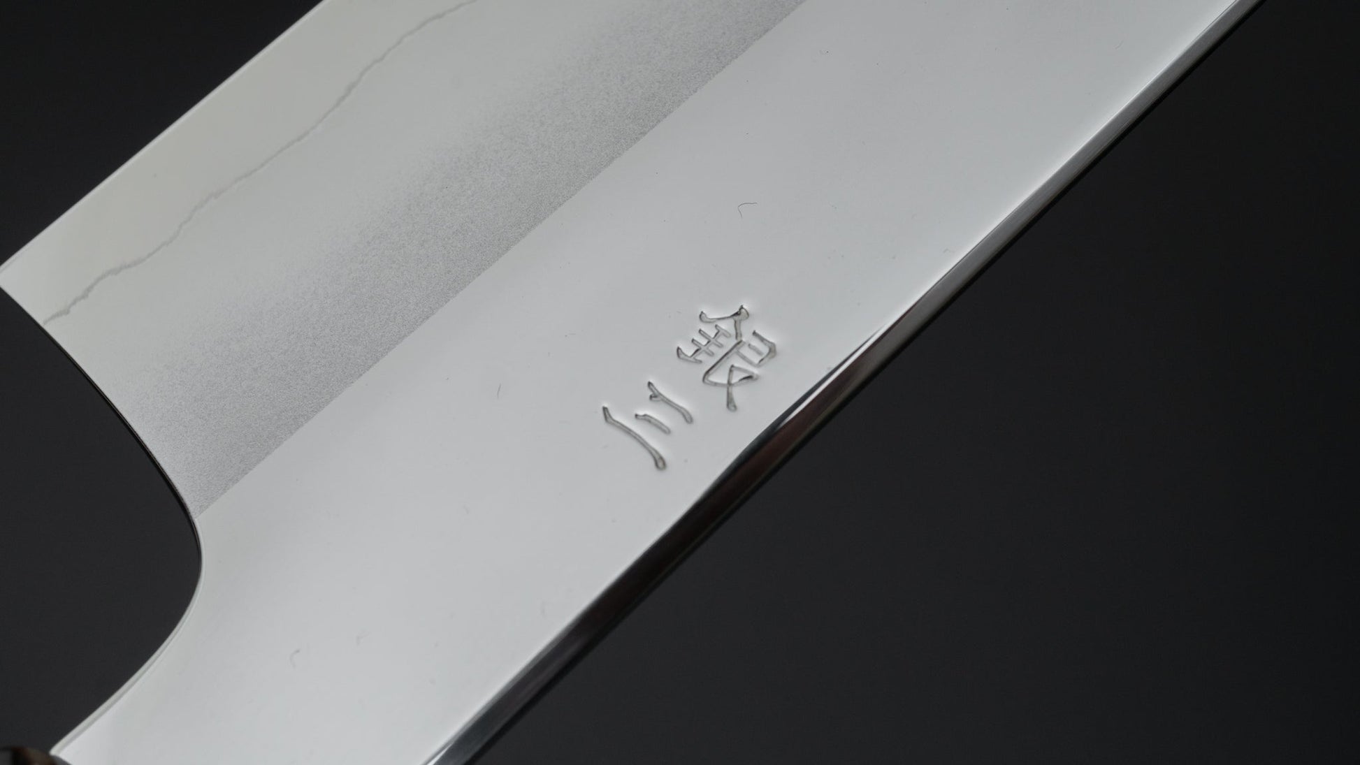 Kikuchiyo is a blacksmith based in Sakai. He was under tutelage of a legendary blacksmith in this region for well over two decades before taking over his masters forge. He’s known for his high quality White and Blue steel blades but is particularly recognized for his excellent stainless Ginsan (Silver #3) and Honyaki blades. He is an expert of temperatures and is able to achieve the correct hardness and gumminess through his technique. He always works with great ambition and efficiency hoping to develop his skills as a craftsman, modeling each of his knives on the image of his master’s forge.