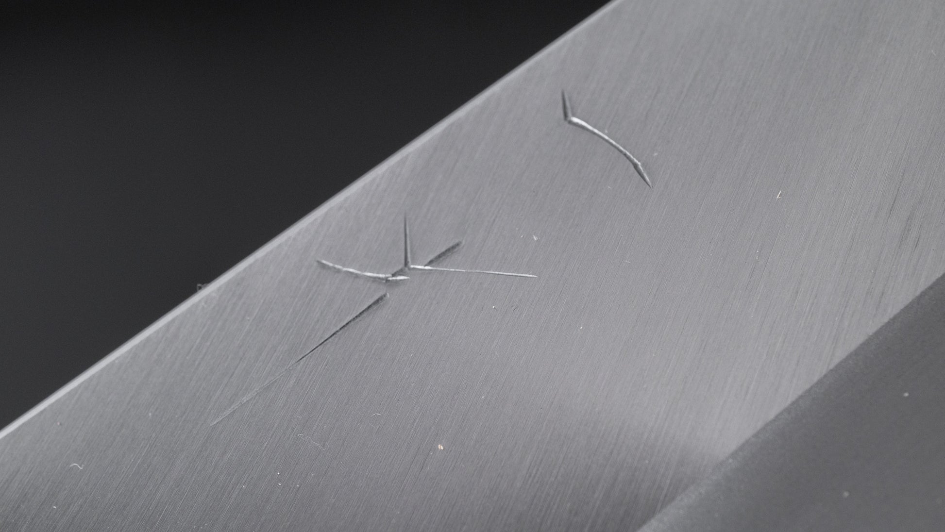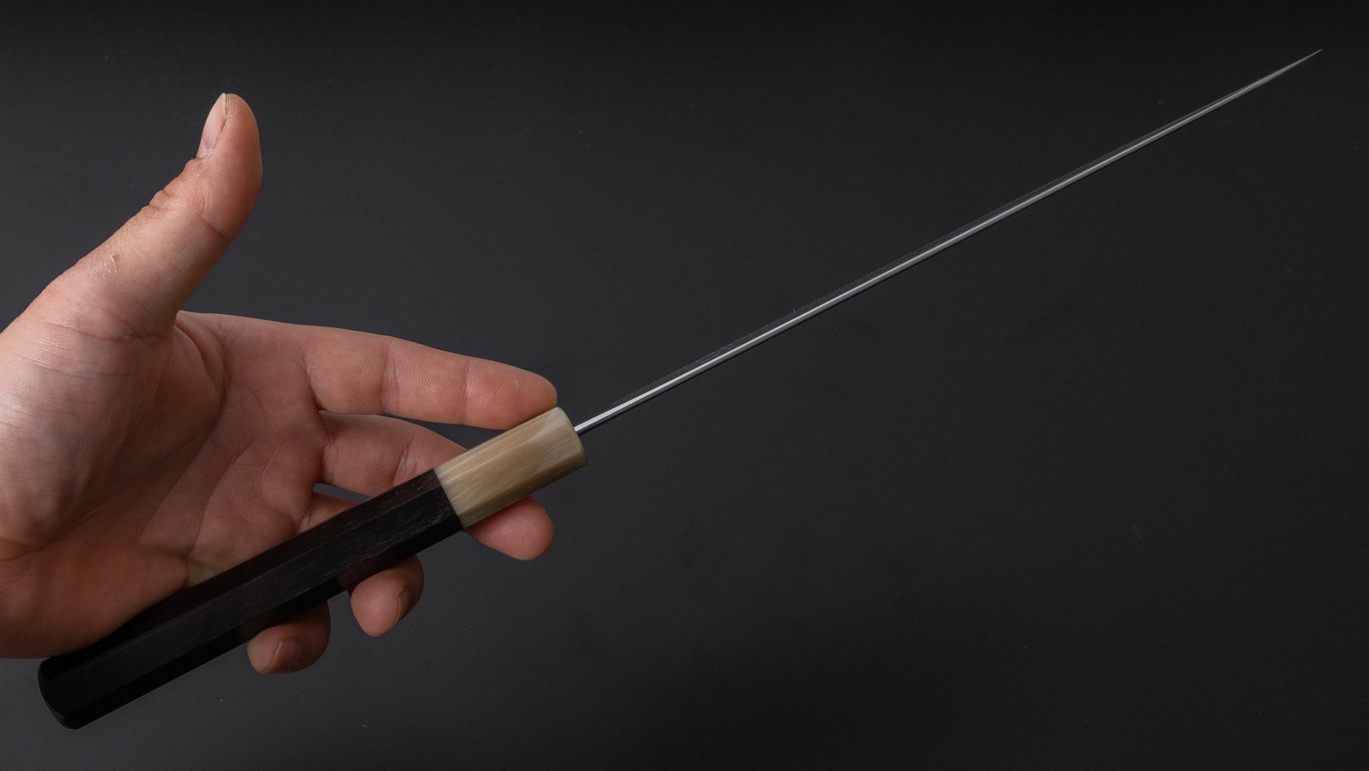 Each blade is meticulously polished and sharpened by Jiro-san using his favorite combination of synthetic and natural whetstones. The result is a perfectly even, finely polished bevel, not only beautiful but also contributing to the exceptional performance of these knives, the highest-performing we’ve ever encountered.