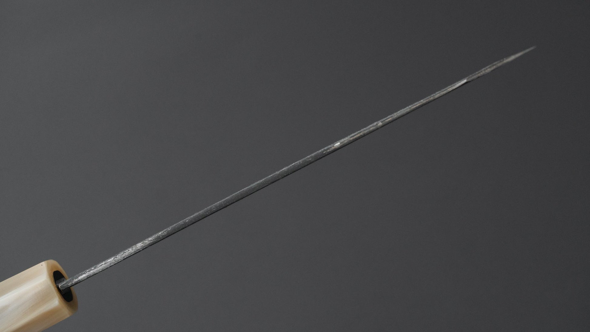 The Hitohira Togashi Kurouchi series features Blue and White steel #2 blades. These are characterized by their rustic kurouchi finish. This is a natural black scaling left over from the forging process. What makes this series unique is the fact the the blacksmith controls the thickness of the spine. With knives fully polished the sharpeners can adjust the spine thickness and taper to their liking. Here this is not the case otherwise the dark finish will be lost. Next to the aesthetics the kurouchi adds it reduces the oxidation on the part of the blade. While these blades look and feel more rustic the performance is incredible. The broad and finely polished bevels ensure a smooth cutting feel.