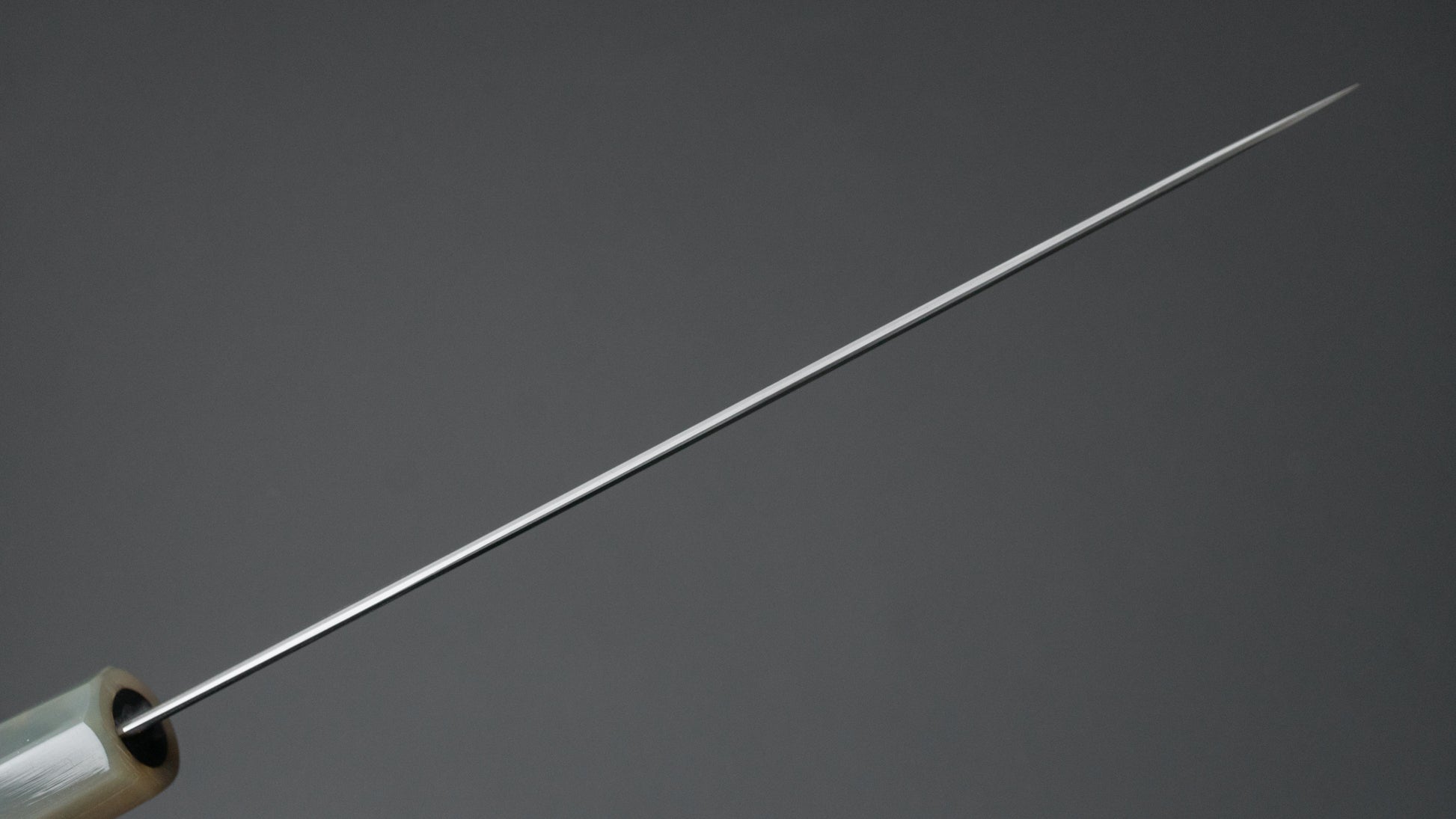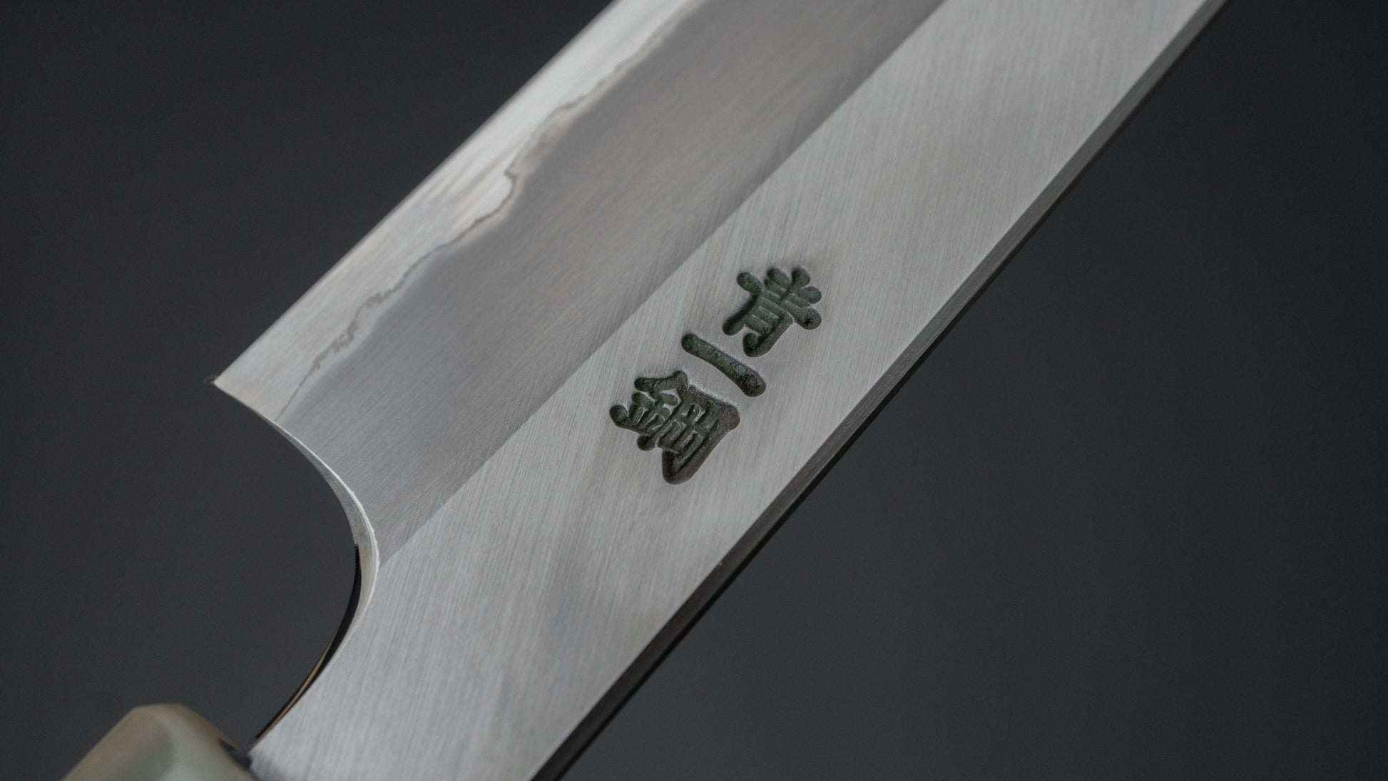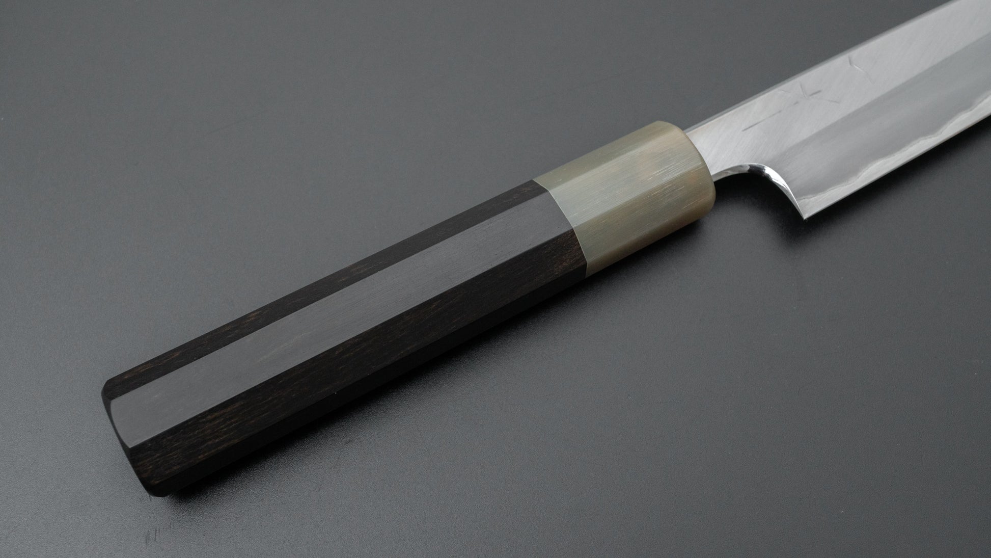 The Togashi Migaki with stainless cladding is one of the highest grade series we offer at Karasu. Made with only Blue #1 of White #1 steel this featured a unique Hitohira profile with a crisp wide bevels geometry that are highly polished. Superb cutting performance due to the thin edge but without feeling delicate. The fit and finish is high level with fine hardwood handles and characterizing heel polish.