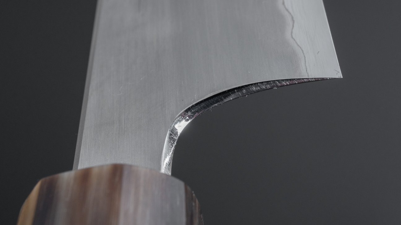 The Togashi Kasumi series belong in the high-end assortment we carry at Karasu. Similar to the Migaki series these are made with only Blue #1 and White #1 steel only with a difference in the geometry. Kenya Togashi is the sharpener of both lines but the Kasumi series is ground with a convex grind. The bevels are slightly rounded and these knives do not have a visible shinogi line. Characterized by their incredibly slick and clean aesthetics with smooth and solid performance. By Hitohira design, with high level fit and finish like polished heel and spine and amazing handle quality. To us both the Kasumi and Migaki series by Togashi resemble the traditional craftsmanship and refinement in a way we appreciate most.
