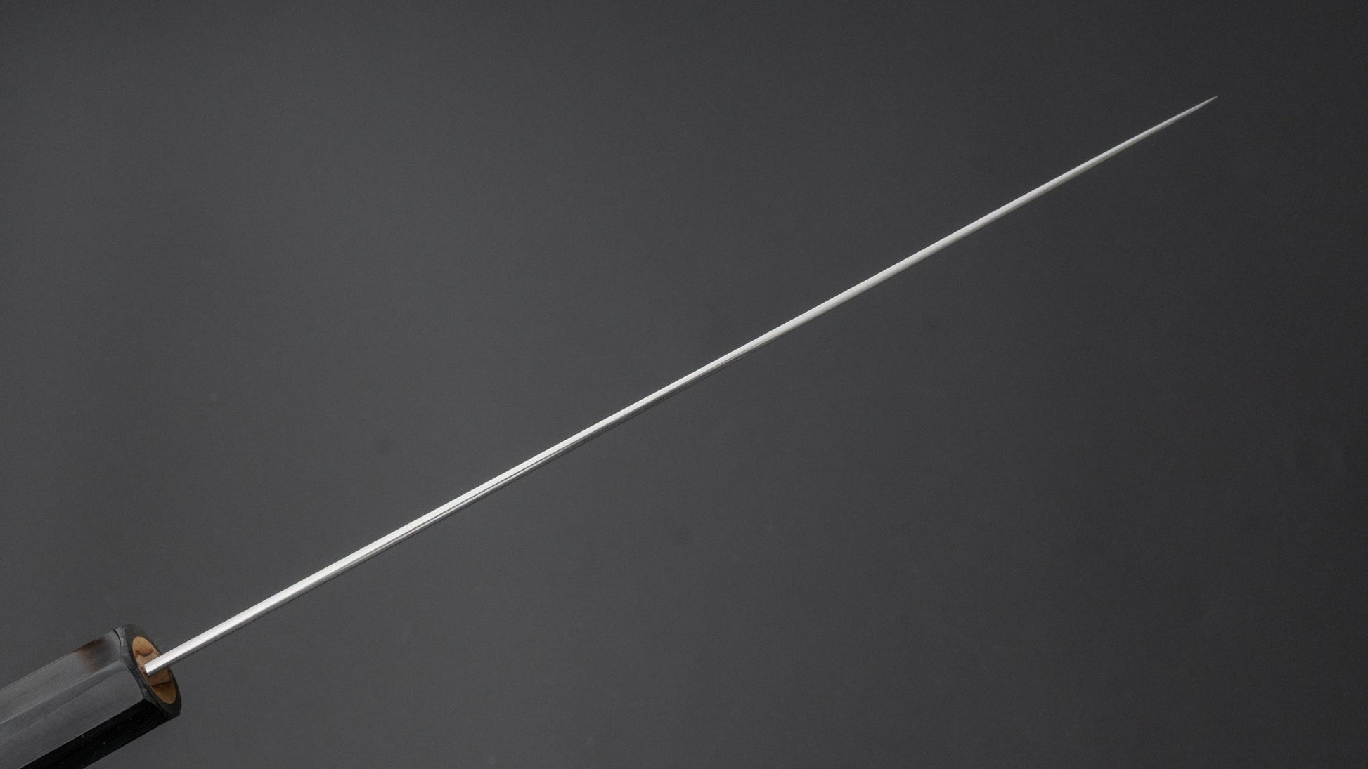 Ashi Hamono, a legendary company based in Sakai. Famed for their mono style and convex grind, Ashi Hamono knives are synonymous with smooth cutting performance. Ashi produces blades from a single piece of steel, known as mono steel knives. It makes for very reliable and strong knives with a very solid feeling. It is true that mono steel knives cannot be hardened to the levels of a San Mai (core-steel w/ cladding construction) knives but Ashi makes up for that with their first-class heat treatment and their superior convex sharpening. Convex sharpening is where the bevels are more rounded instead of flat, minimizing contact between product and blade. This grind, and especially on Ashi level, ensures a smooth cutting performance even when the edge gradually dulls.