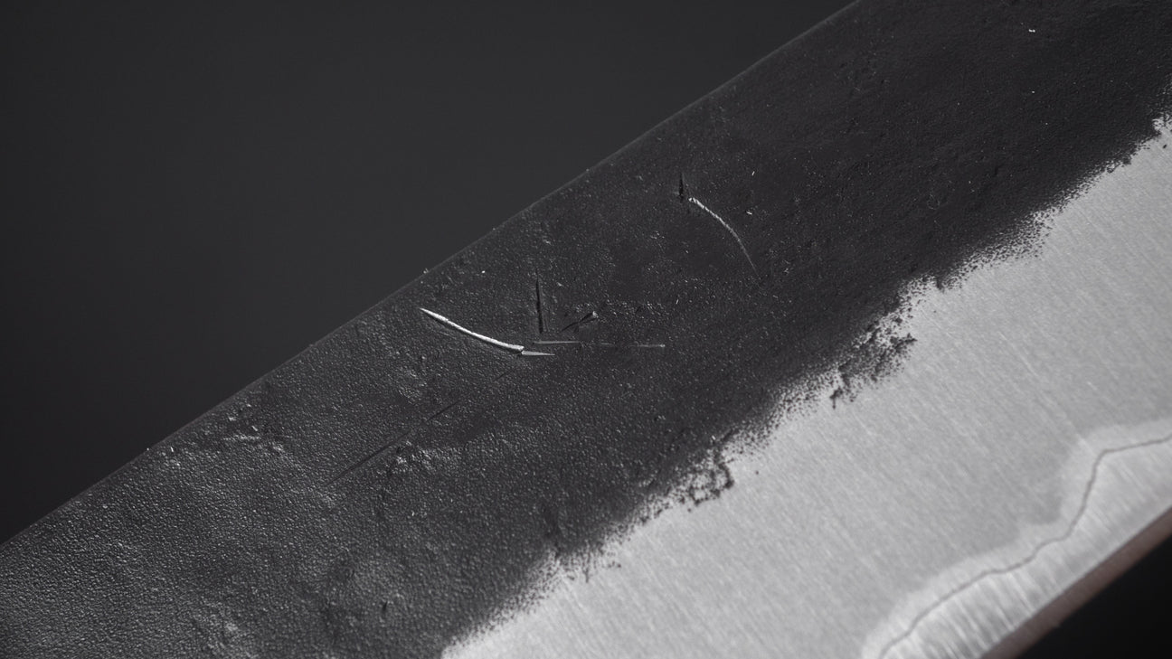 The SB line uses Super Blue (Aogami Super) steel, a high-carbon Japanese steel known for its excellent wear resistance and edge retention. All SB knives have a Super Blue core with stainless steel cladding, providing the advantages of improved corrosion resistance while maintaining the performance characteristics of carbon steel.