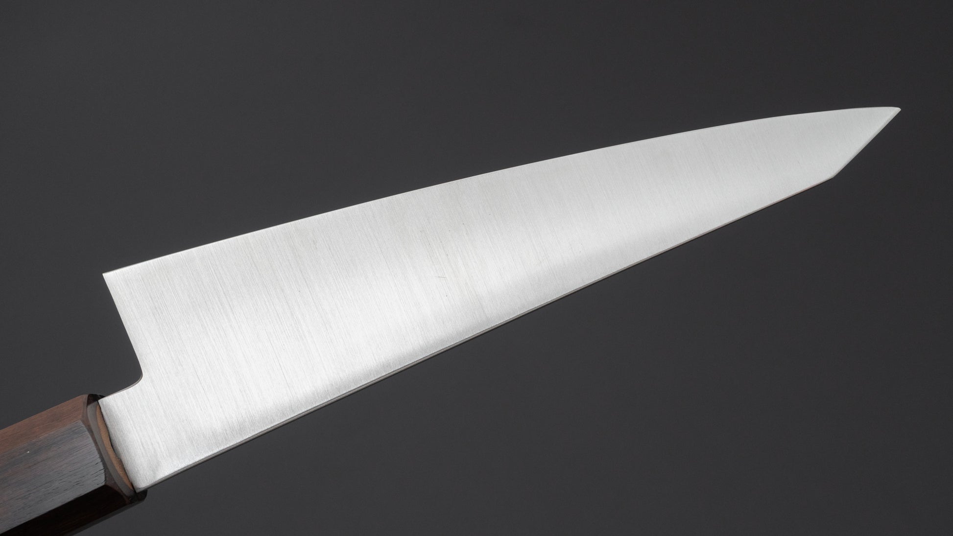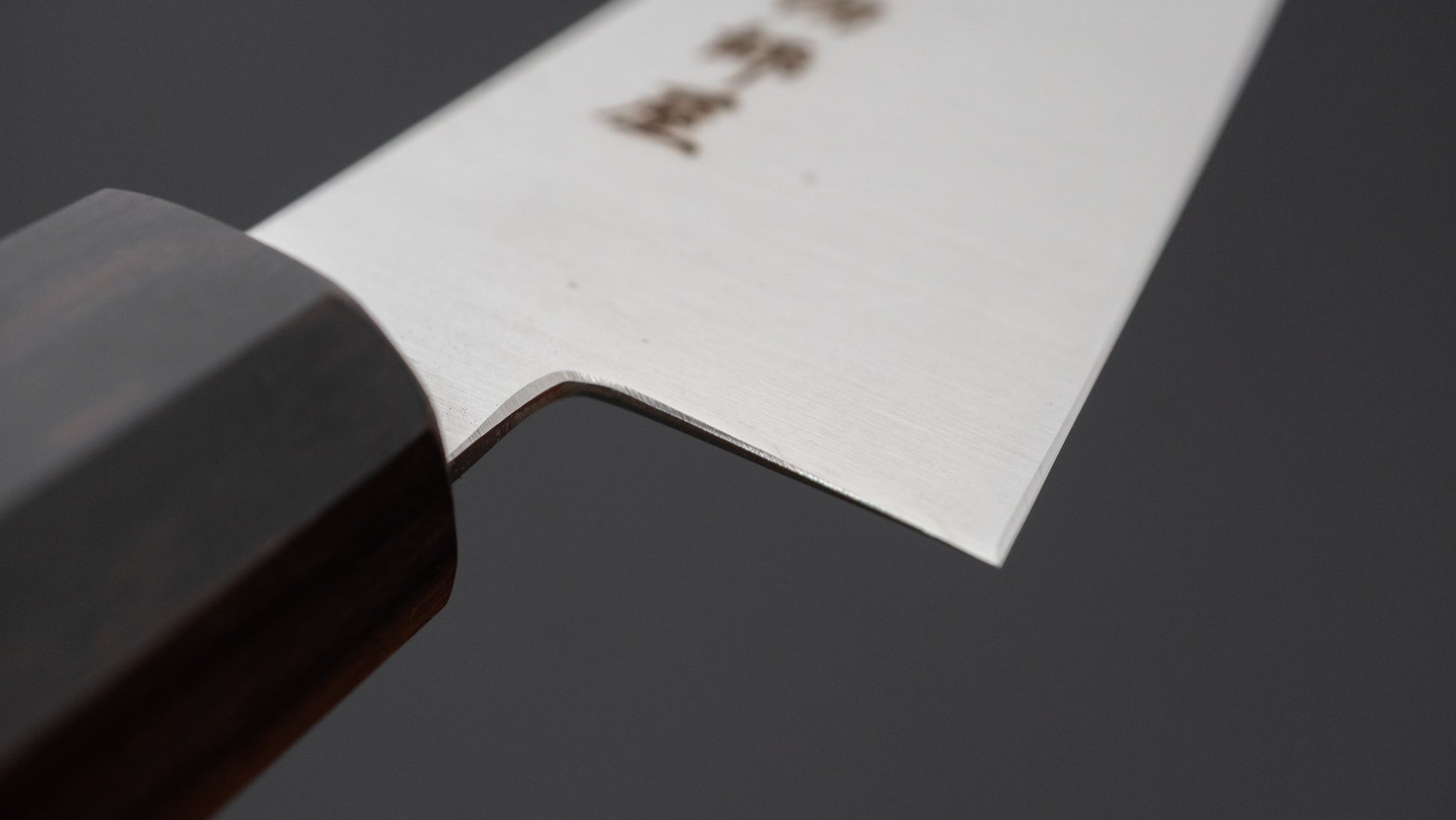 The Honesuki is a Japanese-style butchery knife, mainly used for breaking down and deboning poultry and larger cuts of meat. The Honesuki Kaku version is more suited to poultry work. It has a pronounced heel that makes it great for cutting through cartilage while the Maru version, with its more rounded profile, works better for other types of meat but isn’t quite as efficient on poultry. Many Honesuki knives have an asymmetric grind, so make sure to check the hand orientation before choosing one.