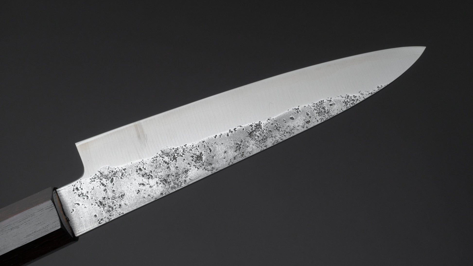 This is a stainless steel knife. Stainless steel gets its name from the inclusion of chromium (10-13%) in the alloy, which forms a protective film that helps prevent rust and corrosion by acting as a barrier between the metal and oxygen. While stainless steel knives are practical, functional, and easier to maintain than carbon steel, they are not completely maintenance-free. With improper care, they can still rust or develop pitting—after all, "stainless" does not mean "stain-free."
