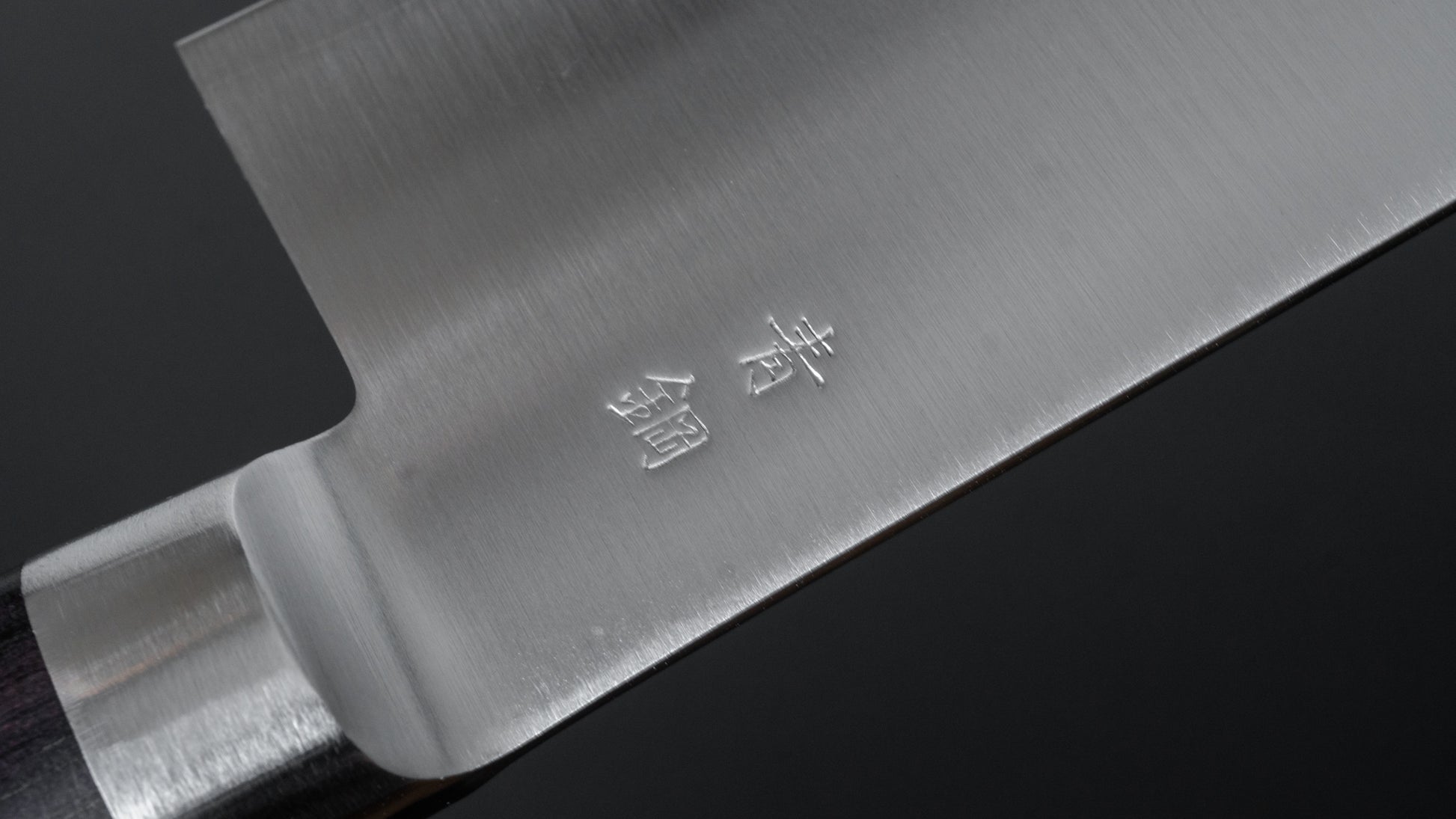 This is a carbon steel knife with a soft stainless steel cladding. Many Japanese knives are constructed with a 3-layer design known as “San Mai,” where a hard, high-quality steel core is sandwiched between two layers of softer steel or iron. In this case, the core is made of carbon steel, while the outer layers, or cladding, are composed of stainless steel. This construction combines the benefits of a carbon steel edge, such as easy sharpening and excellent edge retention, with the added corrosion resistance of stainless steel for the rest of the blade.