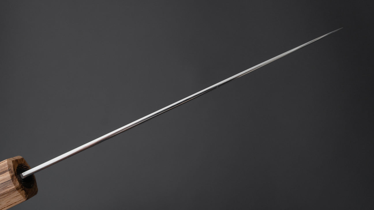 The Western ‘Yo’ handled line is always beautifully polished, with thoughtfully rounded handles, spine, and heels, ensuring comfortable handling. These knives are made with high-performance stainless steel. Great balance of hardness for monosteel blades—tough without being fragile—and carry the solid, confidence-inspiring feel characteristic of monosteel construction. Sharpening is a pleasure, with smooth feedback and clean edge formation.
