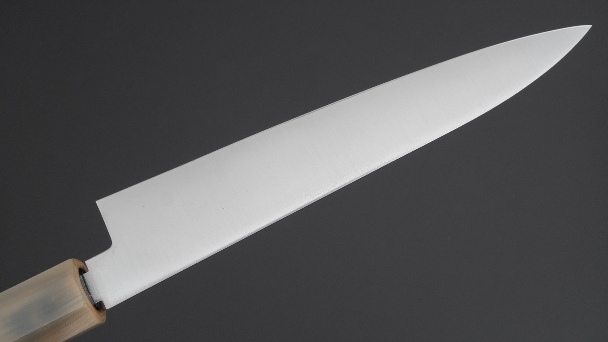 Petty knives (Utilty) have a similar profile as the Gyuto but smaller, commonly ranging from 12 to 15cm. A shape most often used next to any larger all-purpose blade (gyuto & santoku) although there are many households where this is the go-to knife. Very suitable for the smaller cutting tasks such as cleaning, portioning and peeling fruits and vegetables and cleaning smaller cuts of meat or fish.