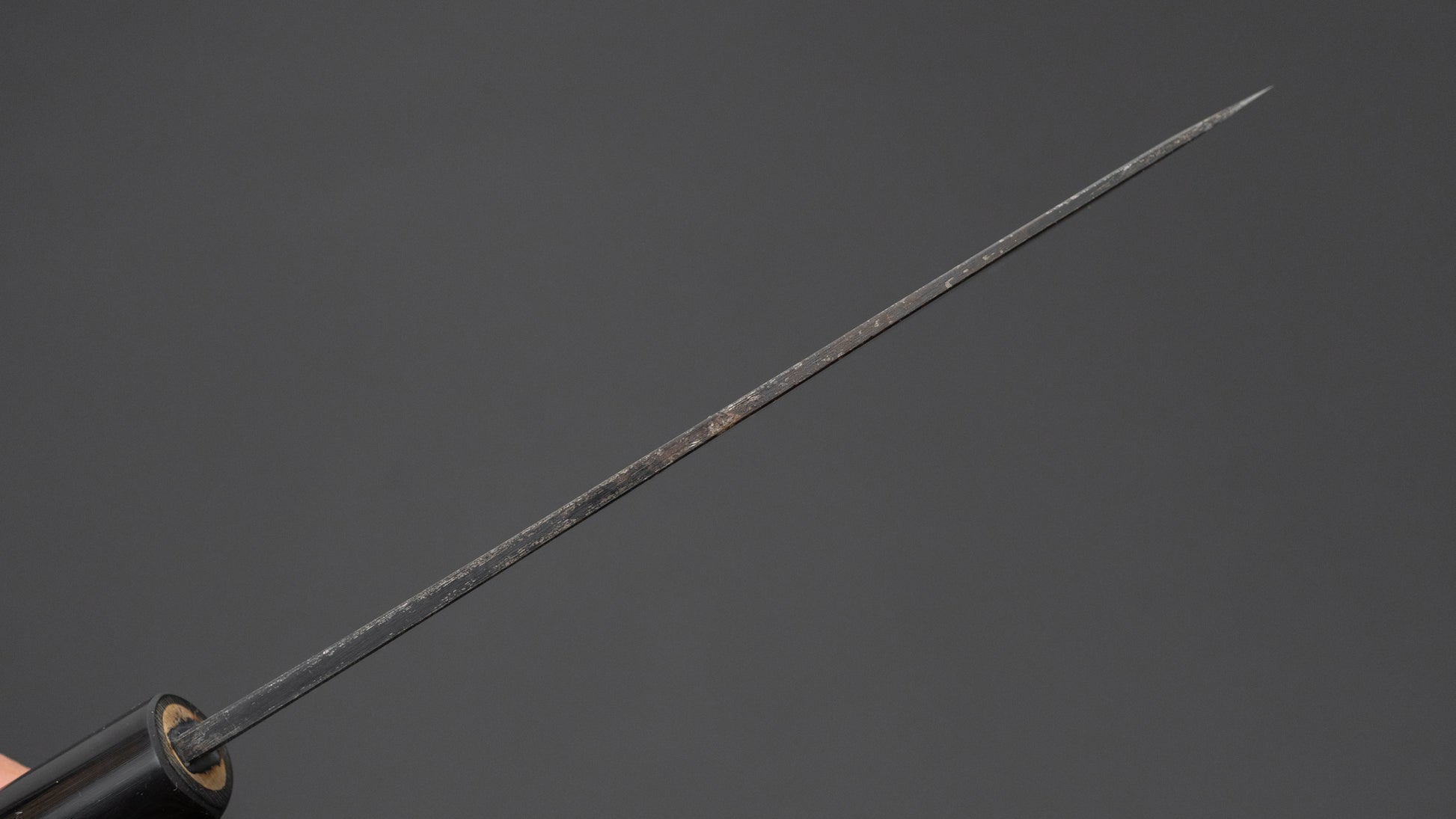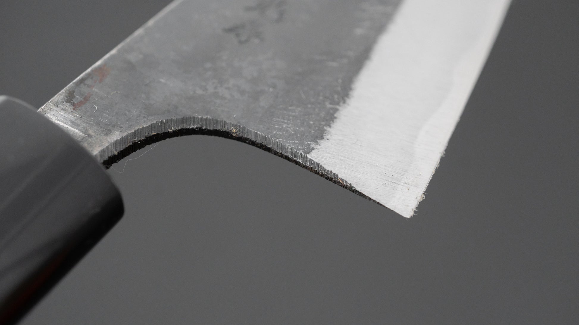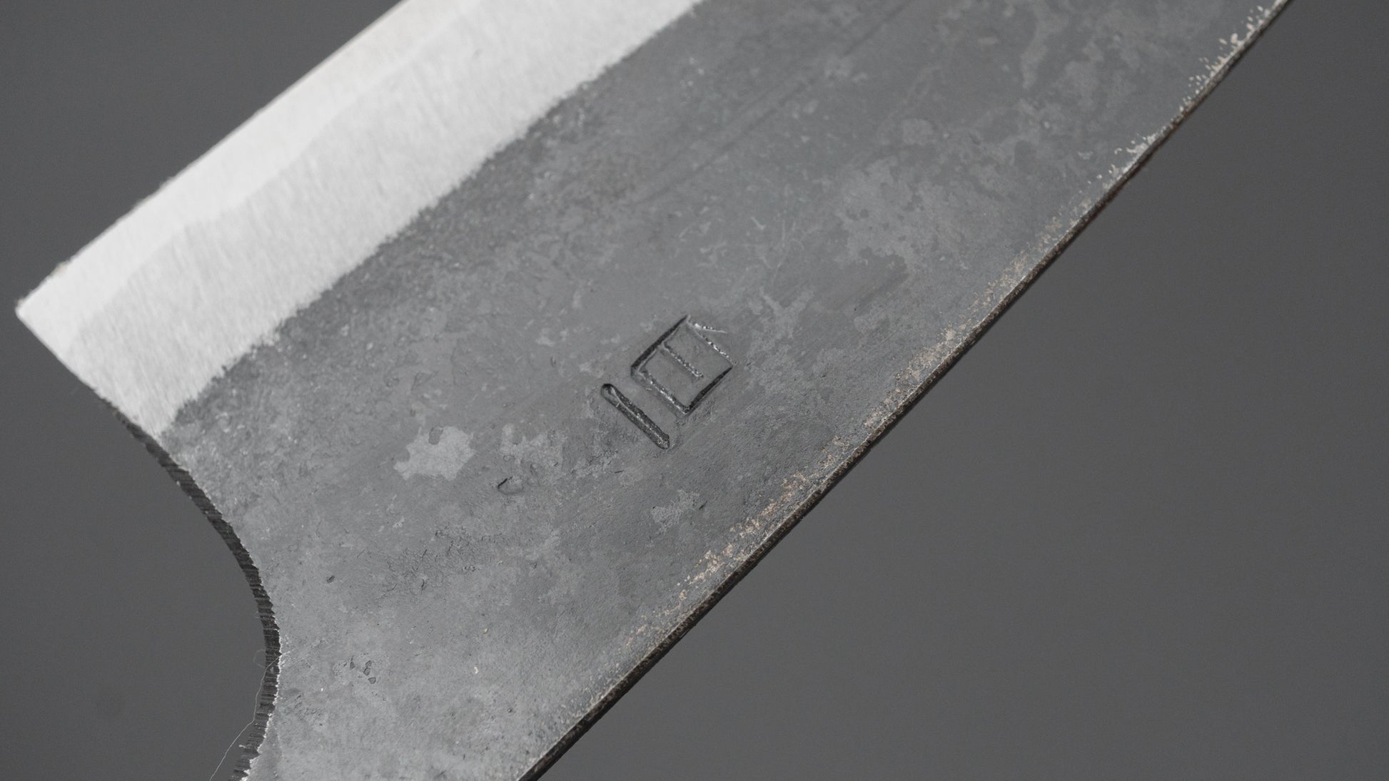 This is a carbon steel knife with a soft stainless steel cladding. Many Japanese knives are constructed with a 3-layer design known as “San Mai,” where a hard, high-quality steel core is sandwiched between two layers of softer steel or iron. In this case, the core is made of carbon steel, while the outer layers, or cladding, are composed of stainless steel. This construction combines the benefits of a carbon steel edge, such as easy sharpening and excellent edge retention, with the added corrosion resistance of stainless steel for the rest of the blade.