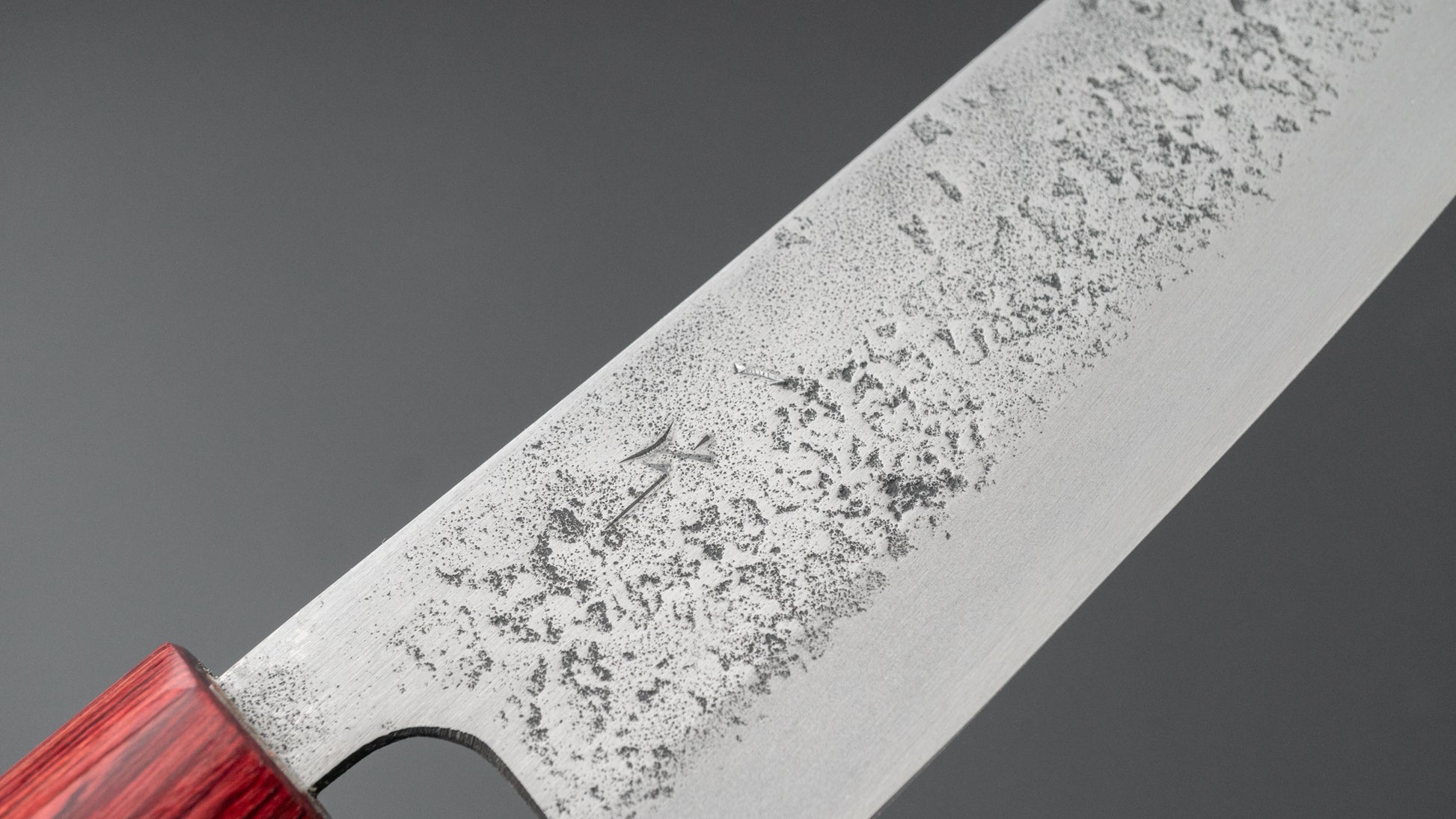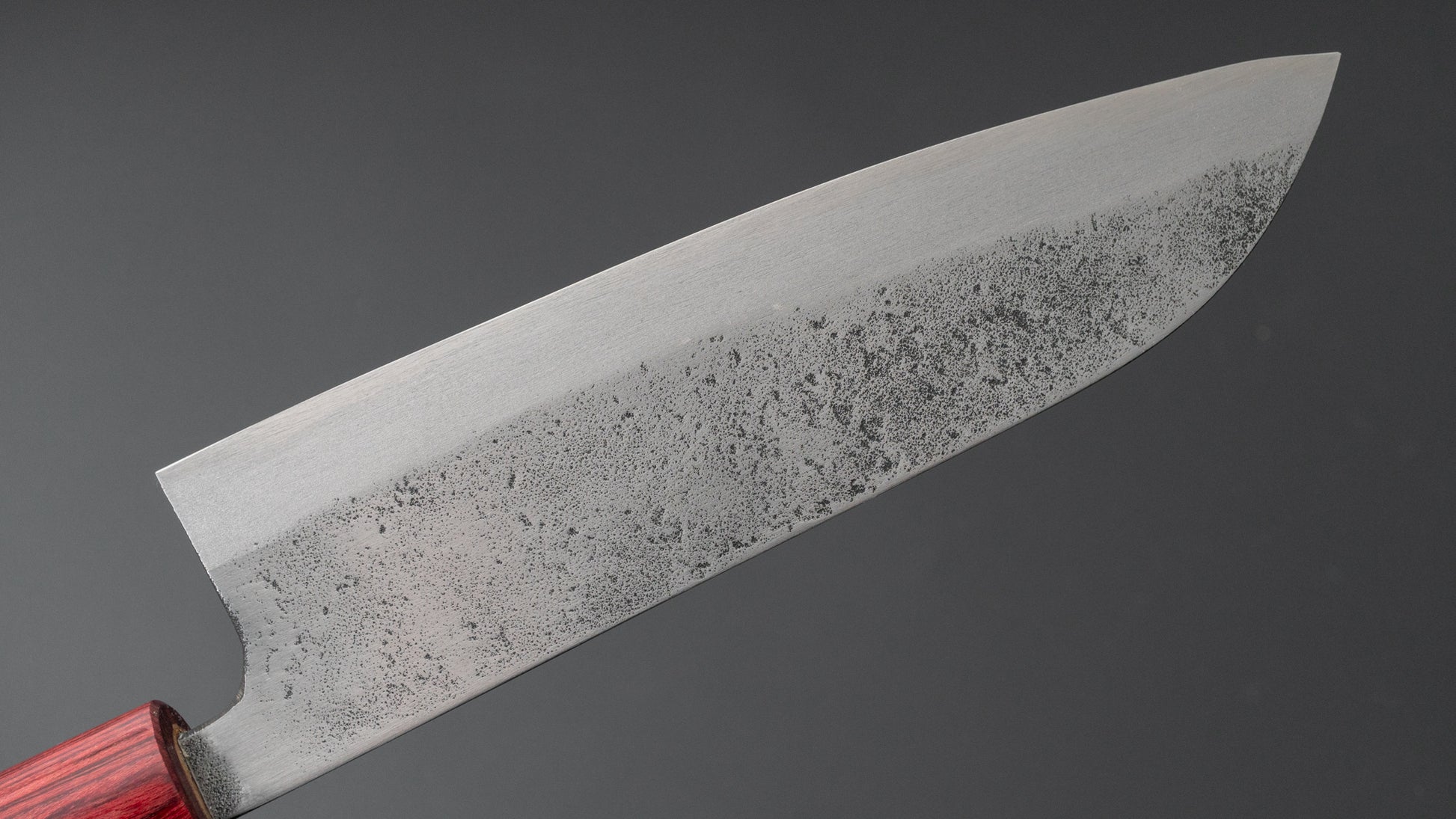 This is a carbon steel knife. Carbon steel is a non-stainless steel that lacks sufficient chromium and/or nickel to protect it from oxidation. As a result, it reacts to moisture and oxygen. While this may sound like a downside, it’s actually a key feature. Carbon steel forms a unique patina over time, is easy to sharpen, and offers excellent edge retention.