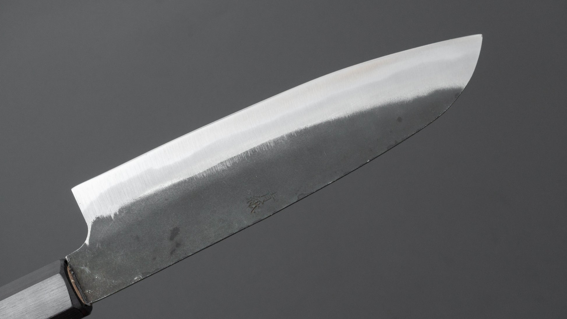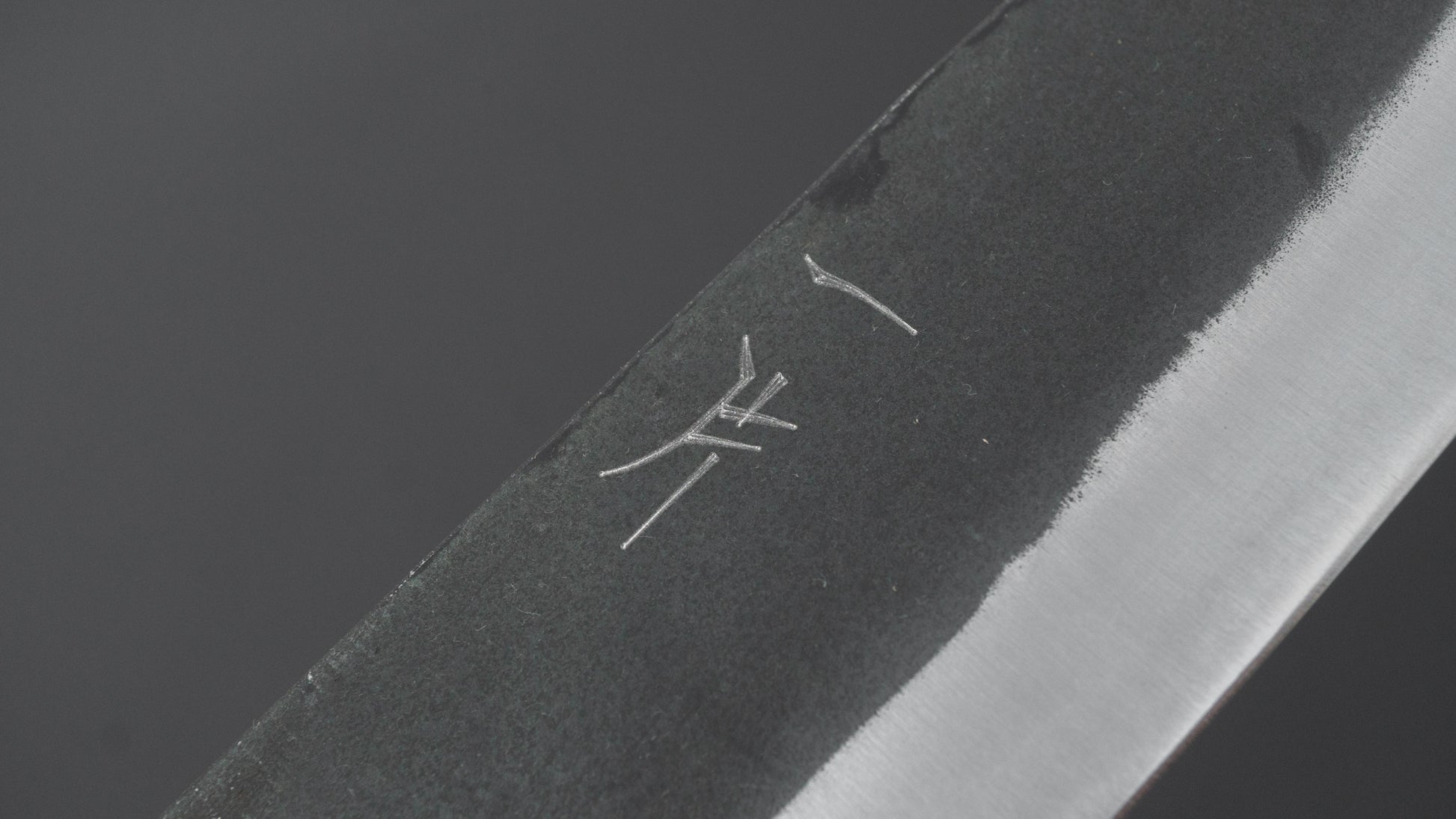 This is a carbon steel knife with a soft stainless steel cladding. Many Japanese knives are constructed with a 3-layer design known as “San Mai,” where a hard, high-quality steel core is sandwiched between two layers of softer steel or iron. In this case, the core is made of carbon steel, while the outer layers, or cladding, are composed of stainless steel. This construction combines the benefits of a carbon steel edge, such as easy sharpening and excellent edge retention, with the added corrosion resistance of stainless steel for the rest of the blade.