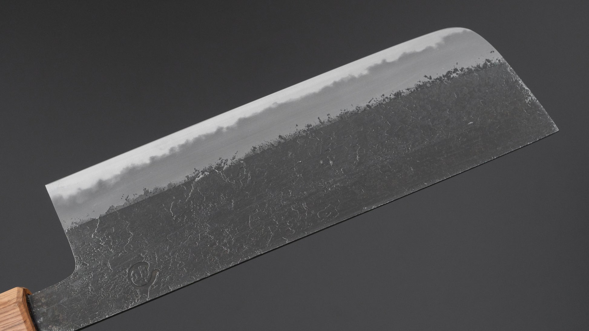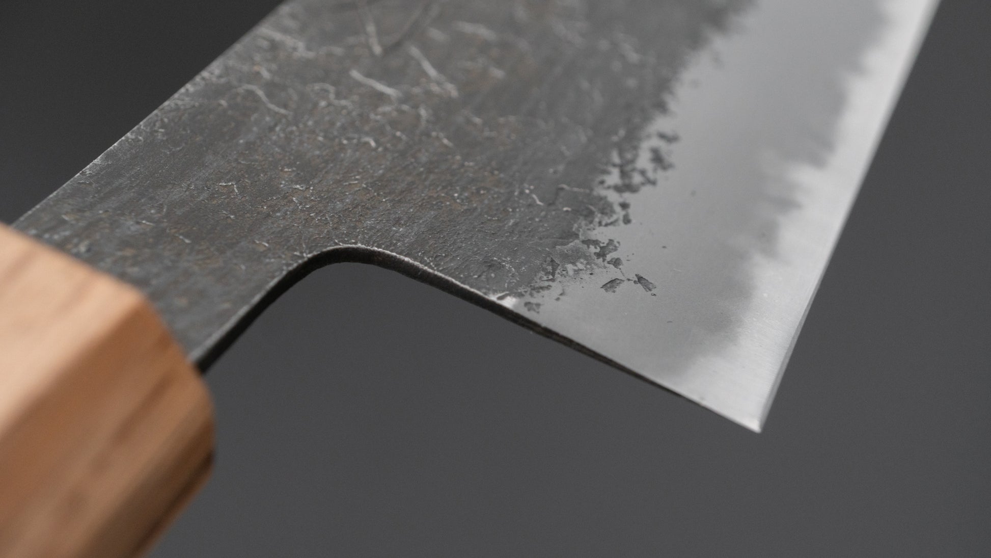 This is a carbon steel knife. Carbon steel is a non-stainless steel that lacks sufficient chromium and/or nickel to protect it from oxidation. As a result, it reacts to moisture and oxygen. While this may sound like a downside, it’s actually a key feature. Carbon steel forms a unique patina over time, is easy to sharpen, and offers excellent edge retention.