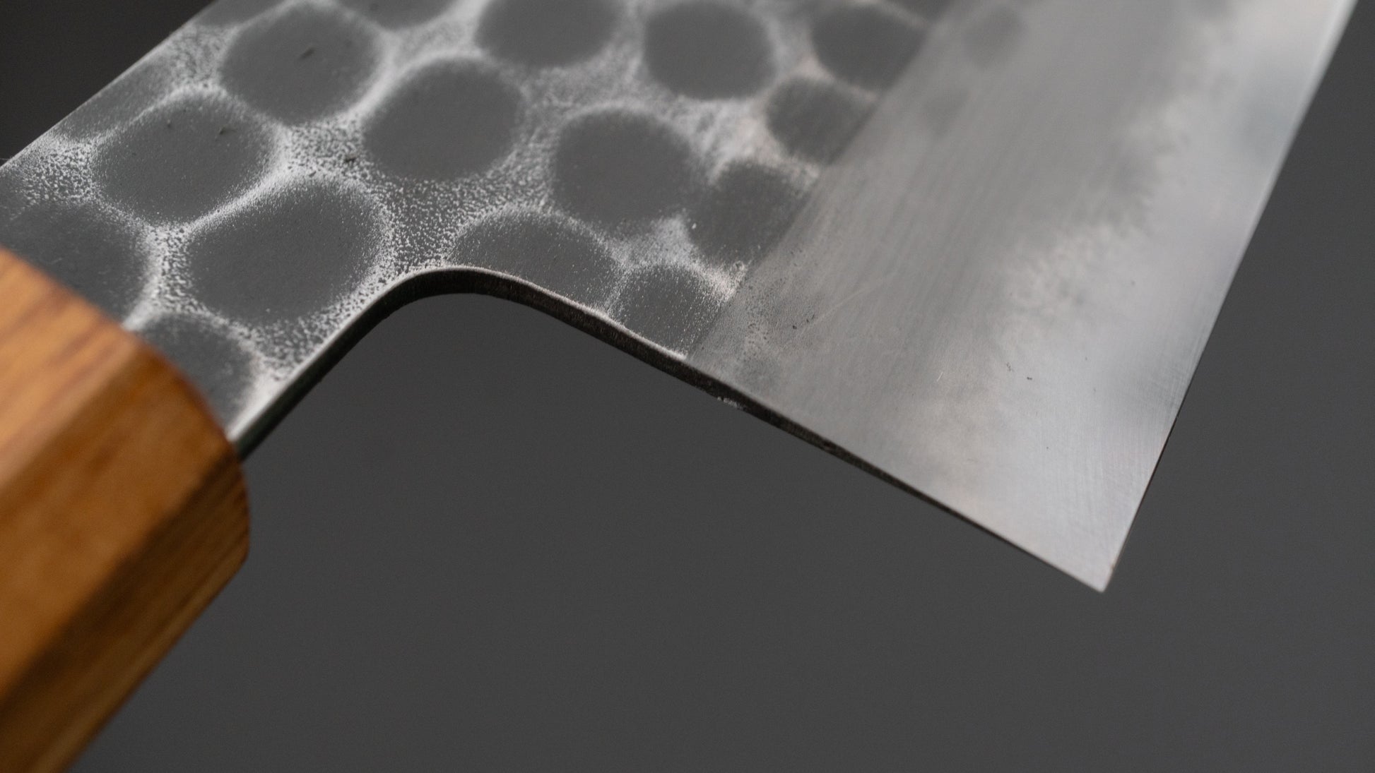 The Hitohira Hinode and Ajikataya series are forged by Sanjo based blacksmith Mutsumi Hinoura. He is the 4th generation blacksmith in the Hinoura family and trained under his father, the highly esteemed master blacksmith Tsukasa Hinoura. He runs a beautifully clean and organized workshop. The blades feature a tsuchime, nashiji or smooth kurouchi finish as is characteristic for Sanjo style knives. His kurouchi is very long lasting and greatly reduces oxidation on the carbon steel blades. The spine is somewhat thick, but tapers down to a very thin tip and similarly towards the edge.