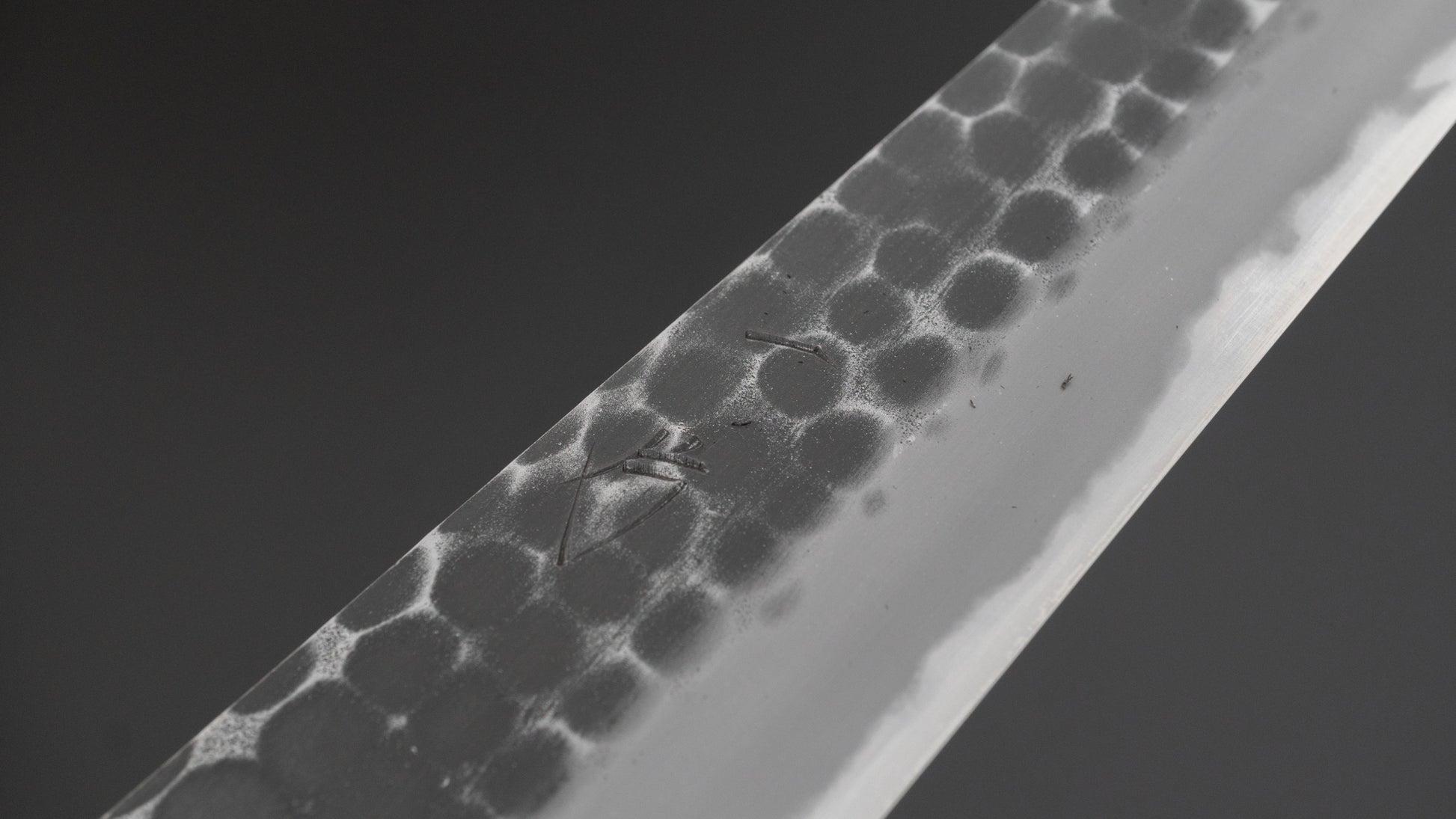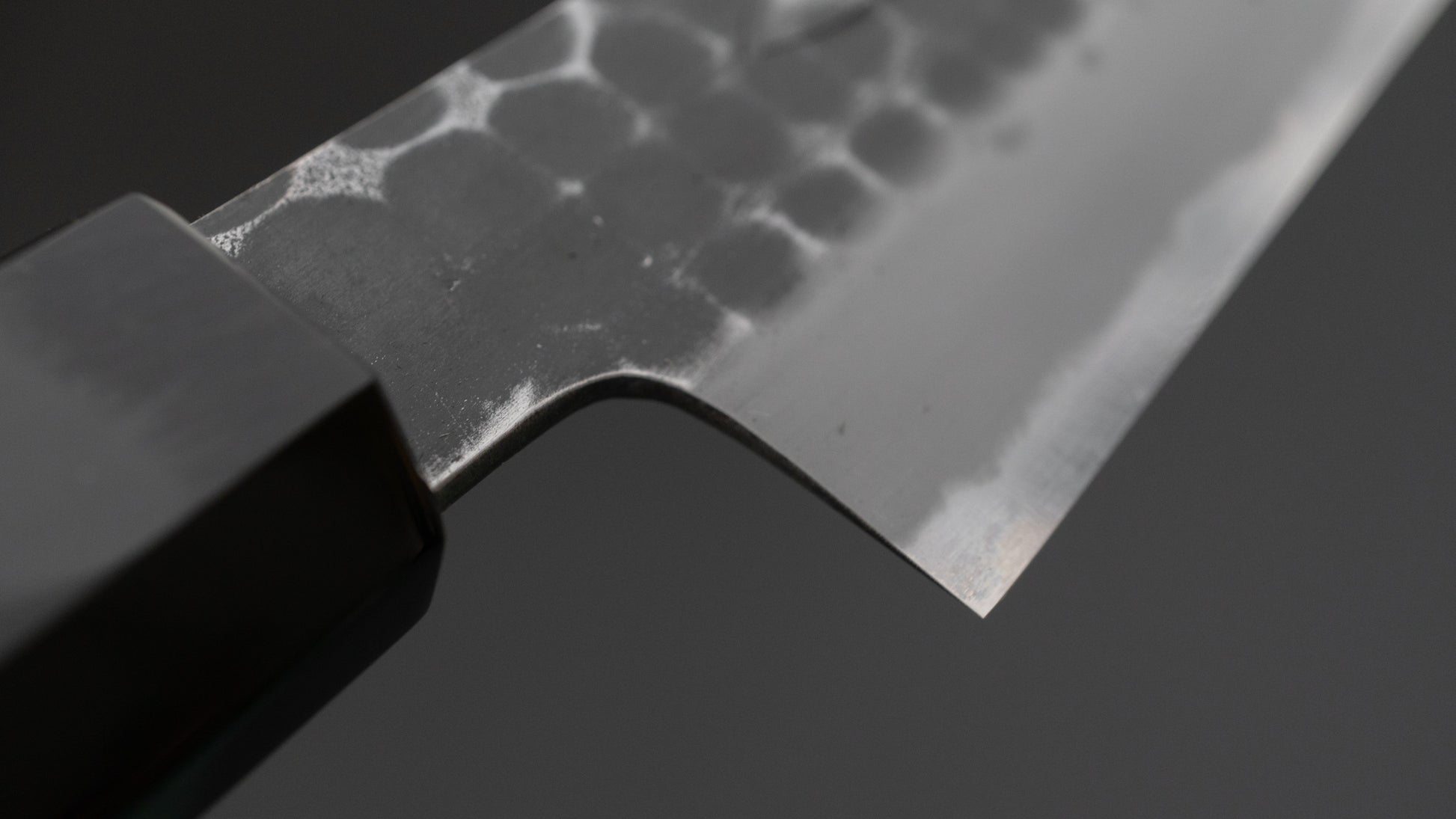 The Hitohira Hinode and Ajikataya series are forged by Sanjo based blacksmith Mutsumi Hinoura. He is the 4th generation blacksmith in the Hinoura family and trained under his father, the highly esteemed master blacksmith Tsukasa Hinoura. He runs a beautifully clean and organized workshop. The blades feature a tsuchime, nashiji or smooth kurouchi finish as is characteristic for Sanjo style knives. His kurouchi is very long lasting and greatly reduces oxidation on the carbon steel blades. The spine is somewhat thick, but tapers down to a very thin tip and similarly towards the edge.