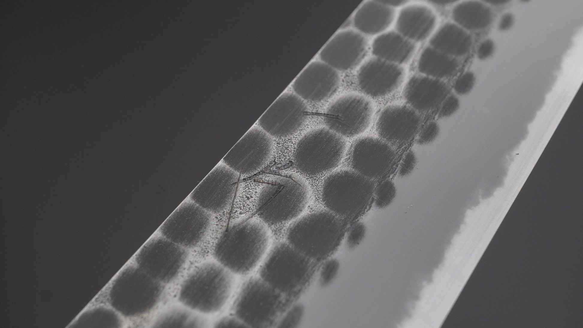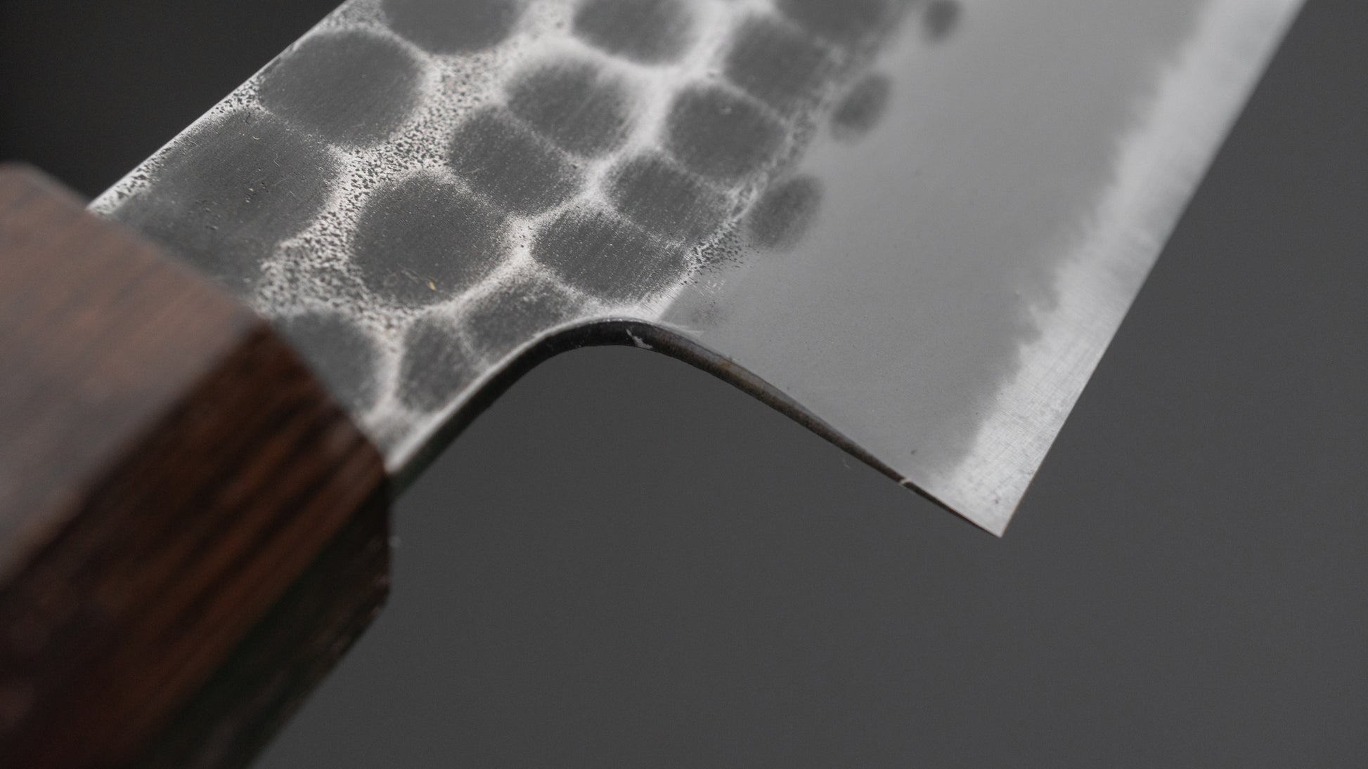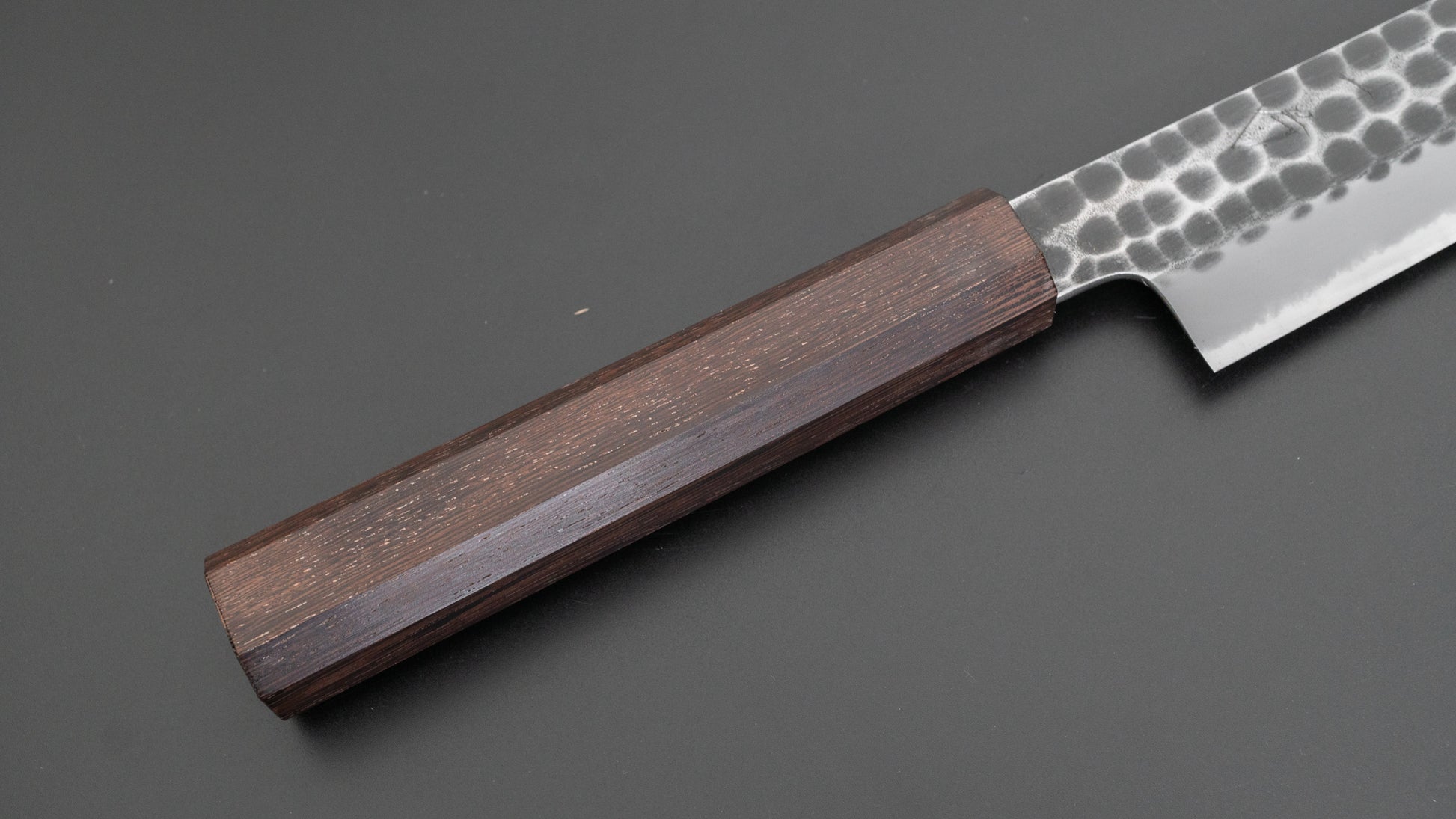 The Hitohira Hinode and Ajikataya series are forged by Sanjo based blacksmith Mutsumi Hinoura. He is the 4th generation blacksmith in the Hinoura family and trained under his father, the highly esteemed master blacksmith Tsukasa Hinoura. He runs a beautifully clean and organized workshop. The blades feature a tsuchime, nashiji or smooth kurouchi finish as is characteristic for Sanjo style knives. His kurouchi is very long lasting and greatly reduces oxidation on the carbon steel blades. The spine is somewhat thick, but tapers down to a very thin tip and similarly towards the edge.
