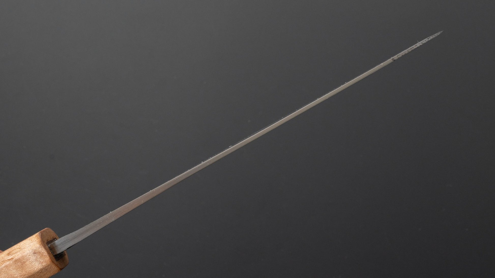 The Hitohira TD series consists of sturdy handmade knives from Sanjo, Niigata. All the knives we carry in the TD series are hand forged which makes for a noticeable improvement in steel quality. Very good prices for hand-forged knives. They come in kurouchi, tsuchime, nashiji and sometimes migaki finished stainless cladding on either Blue #2 or SLD core steel. Like many Sanjo made knives, they have spines that are somewhat thicker towards the neck, making for a nice grip and a little more weight. Very well made and dependable knives.