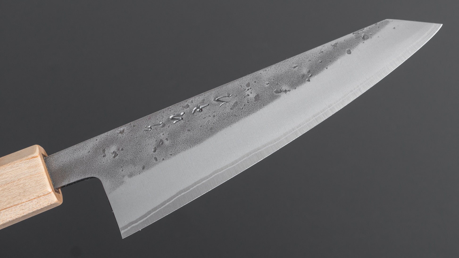 This is a carbon steel knife with a soft stainless steel cladding. Many Japanese knives are constructed with a 3-layer design known as “San Mai,” where a hard, high-quality steel core is sandwiched between two layers of softer steel or iron. In this case, the core is made of carbon steel, while the outer layers, or cladding, are composed of stainless steel. This construction combines the benefits of a carbon steel edge, such as easy sharpening and excellent edge retention, with the added corrosion resistance of stainless steel for the rest of the blade.