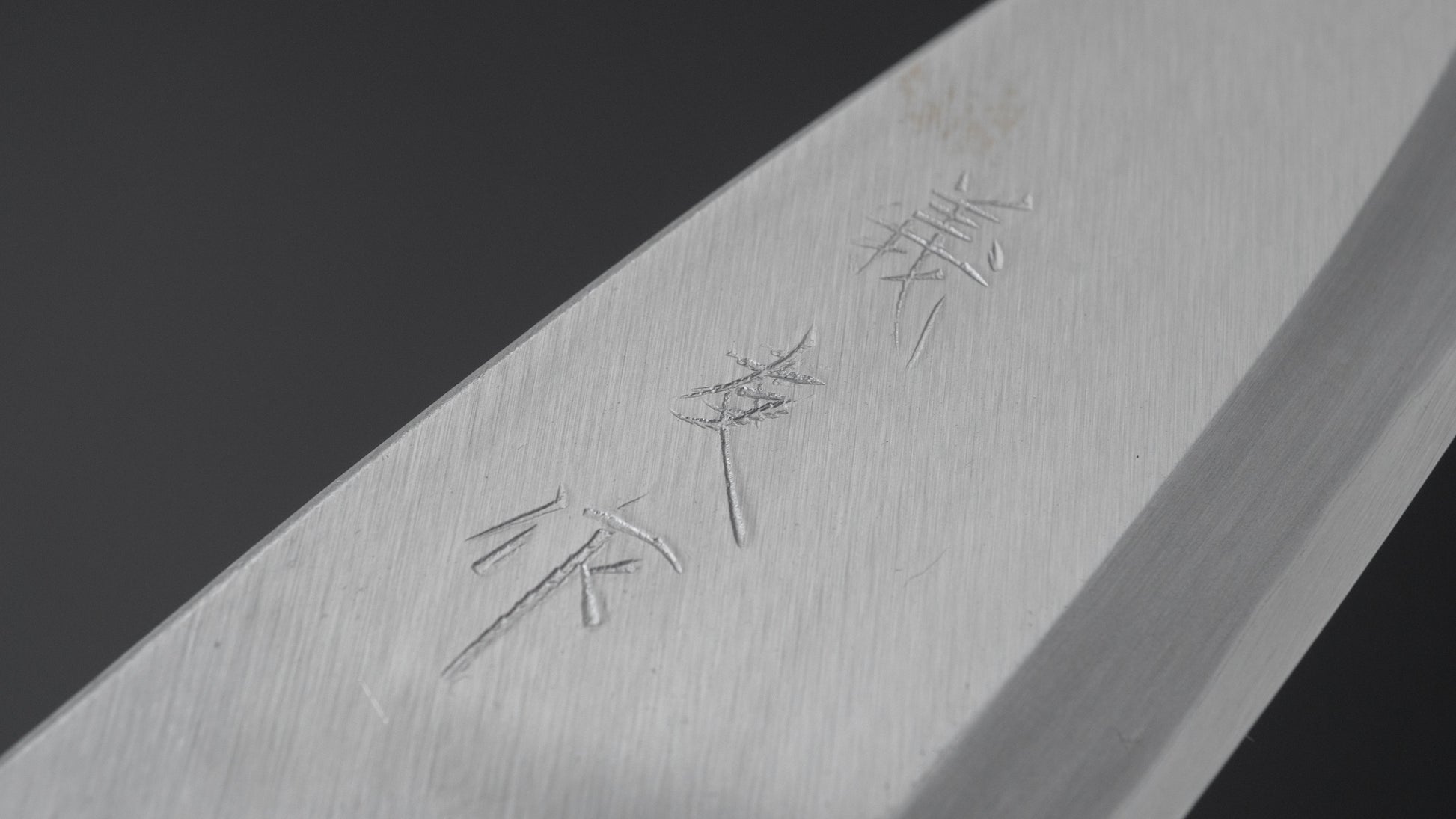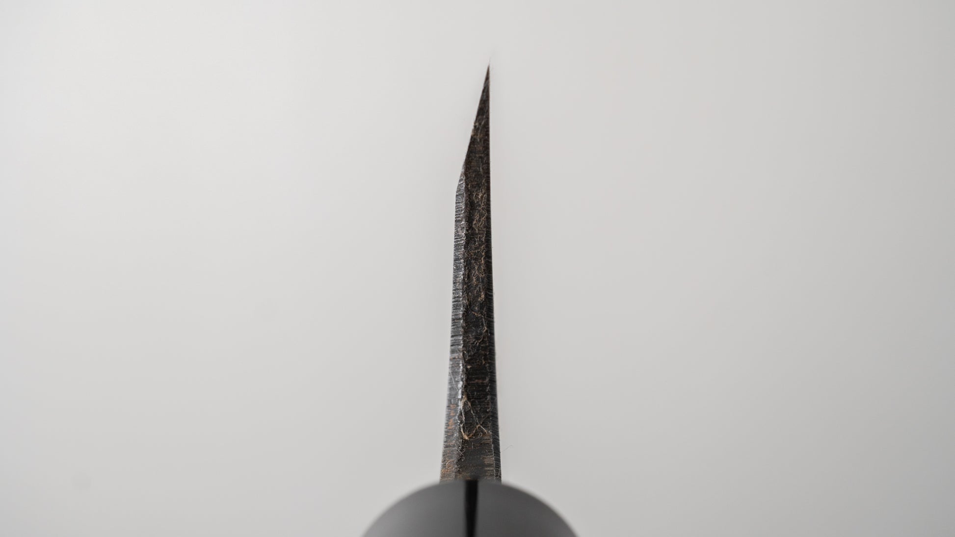 This is a carbon steel knife. Carbon steel is a non-stainless steel that lacks sufficient chromium and/or nickel to protect it from oxidation. As a result, it reacts to moisture and oxygen. While this may sound like a downside, it’s actually a key feature. Carbon steel forms a unique patina over time, is easy to sharpen, and offers excellent edge retention.