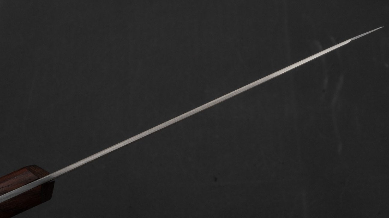 The Honesuki is a Japanese-style butchery knife, mainly used for breaking down and deboning poultry and larger cuts of meat. The Honesuki Kaku version is more suited to poultry work. It has a pronounced heel that makes it great for cutting through cartilage while the Maru version, with its more rounded profile, works better for other types of meat but isn’t quite as efficient on poultry. Many Honesuki knives have an asymmetric grind, so make sure to check the hand orientation before choosing one.
