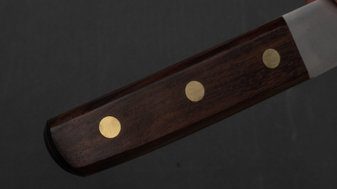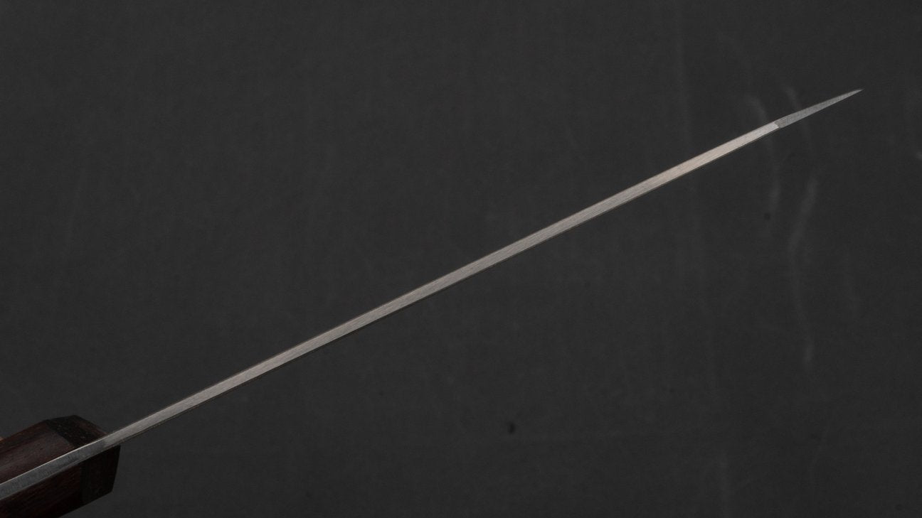 The Honesuki is a Japanese-style butchery knife, mainly used for breaking down and deboning poultry and larger cuts of meat. The Honesuki Kaku version is more suited to poultry work. It has a pronounced heel that makes it great for cutting through cartilage while the Maru version, with its more rounded profile, works better for other types of meat but isn’t quite as efficient on poultry. Many Honesuki knives have an asymmetric grind, so make sure to check the hand orientation before choosing one.