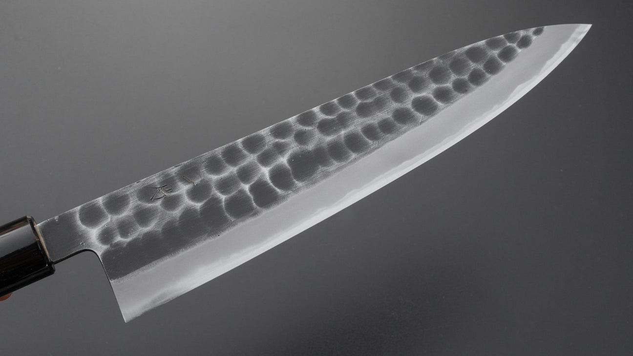 The Hitohira Hinode and Ajikataya series are forged by Sanjo based blacksmith Mutsumi Hinoura. He is the 4th generation blacksmith in the Hinoura family and trained under his father, the highly esteemed master blacksmith Tsukasa Hinoura. He runs a beautifully clean and organized workshop. The blades feature a tsuchime, nashiji or smooth kurouchi finish as is characteristic for Sanjo style knives. His kurouchi is very long lasting and greatly reduces oxidation on the carbon steel blades. The spine is somewhat thick, but tapers down to a very thin tip and similarly towards the edge.