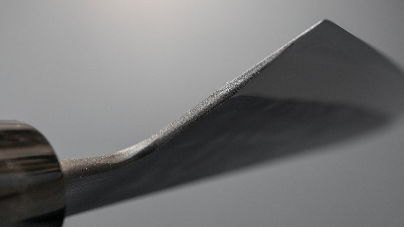 This is a carbon steel knife. Carbon steel is a non-stainless steel that lacks sufficient chromium and/or nickel to protect it from oxidation. As a result, it reacts to moisture and oxygen. While this may sound like a downside, it’s actually a key feature. Carbon steel forms a unique patina over time, is easy to sharpen, and offers excellent edge retention.