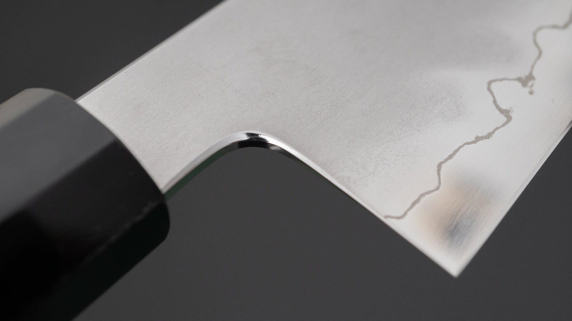 Silver steel is the newest edition to the Tetsujin range. High hardness (63+) with superb sharpening ability and edge formation. The Silver steel series features two different finishes; Kasumi and Ukiba. Kasumi is the standard finish similar to the blue steel with shiny core and mat soft cladding. Ukiba is a different scratch pattern going from handle to tip with shiny cladding.
