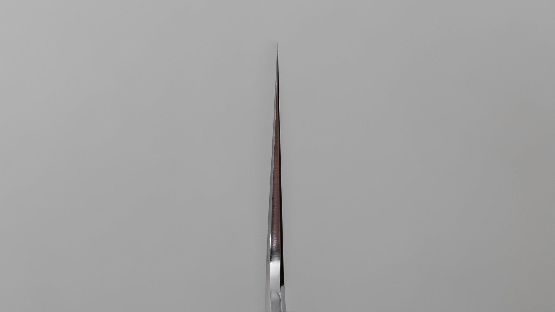 Myojin Sans sharpening is characterized by very even, thin convex (hamaguri) bevels, superior cutting performance, strong geometry and outstanding polish.