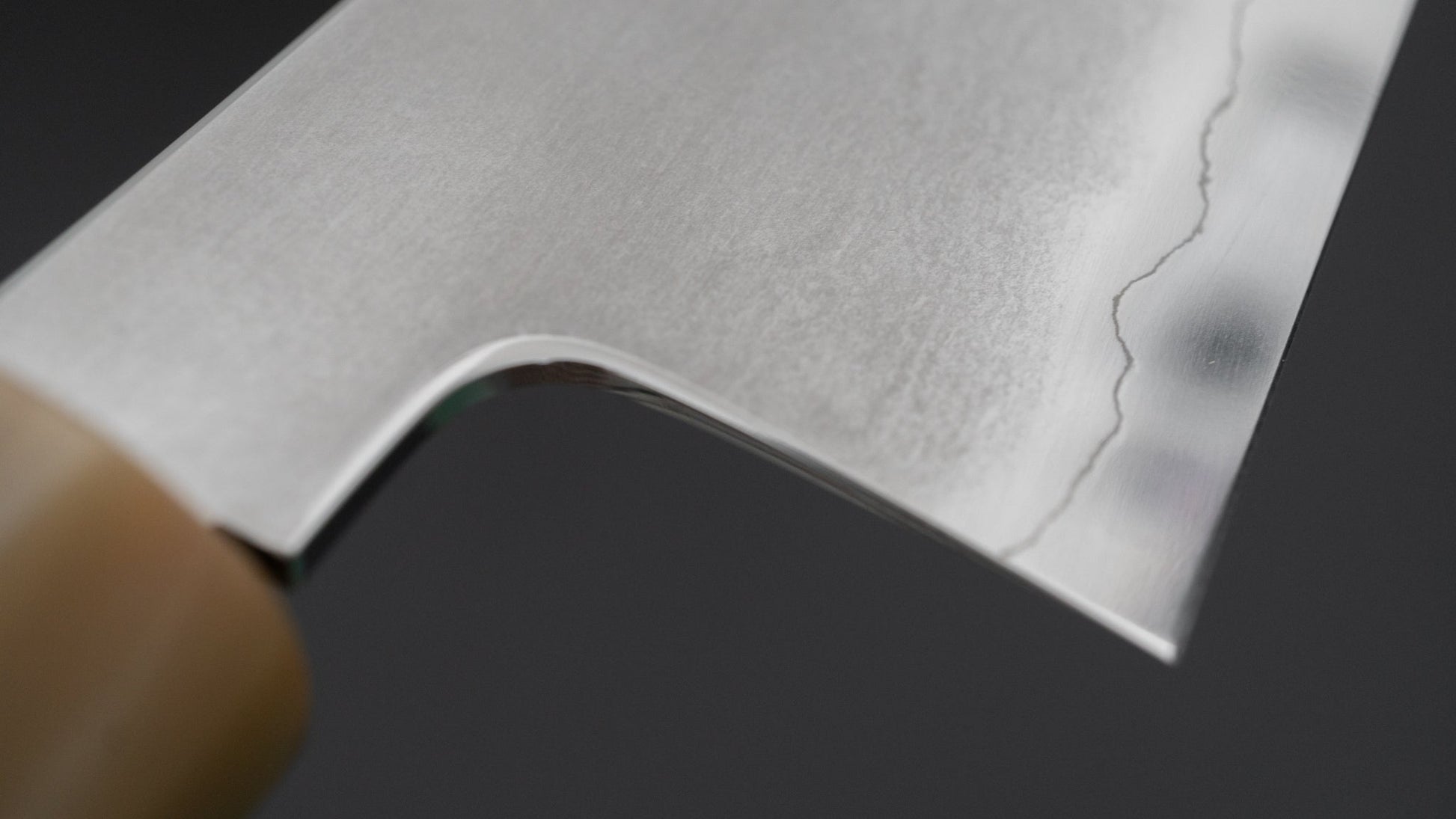 Silver steel is the newest edition to the Tetsujin range. High hardness (63+) with superb sharpening ability and edge formation. The Silver steel series features two different finishes; Kasumi and Ukiba. Kasumi is the standard finish similar to the blue steel with shiny core and mat soft cladding. Ukiba is a different scratch pattern going from handle to tip with shiny cladding.