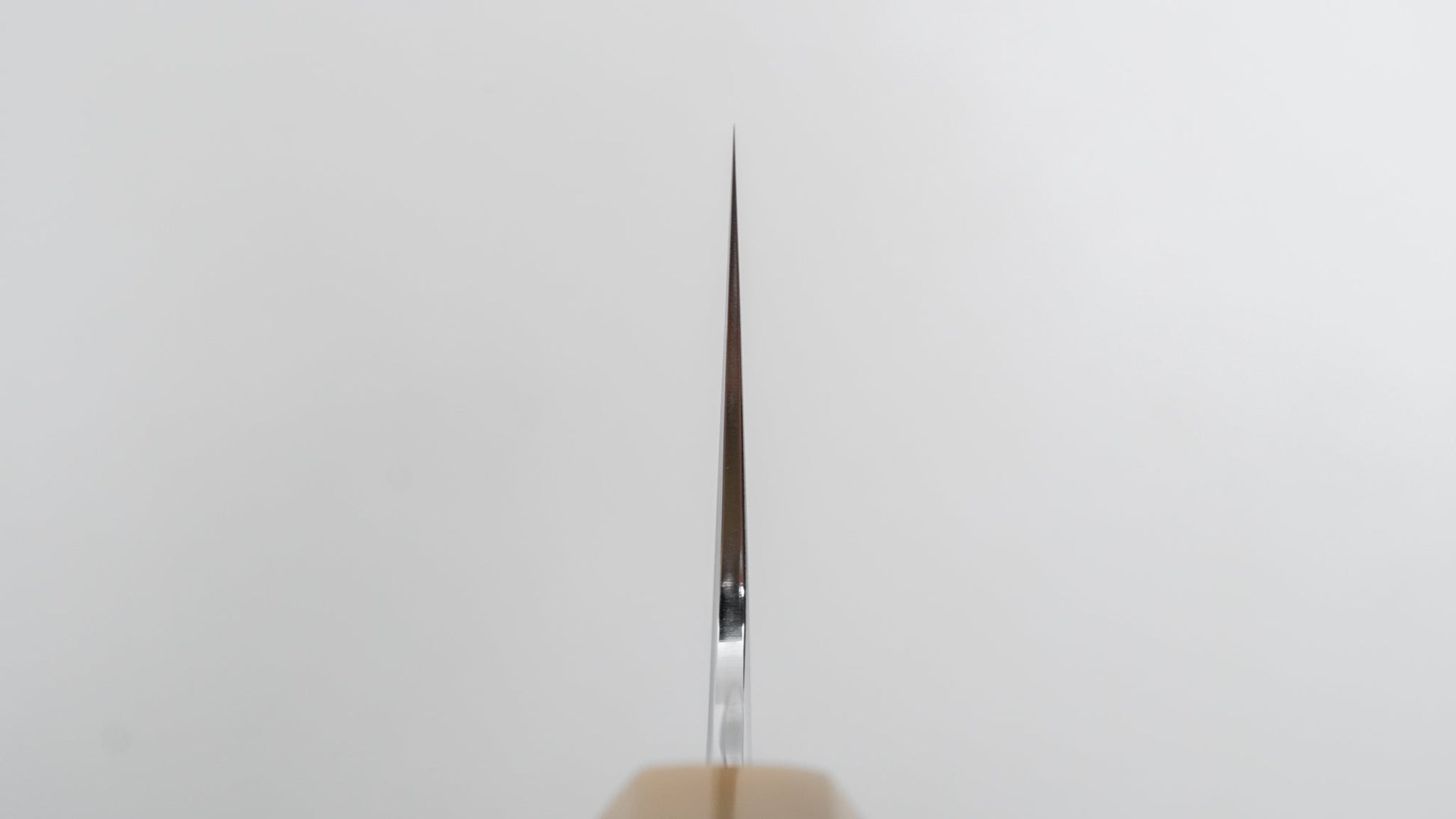 Myojin Sans sharpening is characterized by very even, thin convex (hamaguri) bevels, superior cutting performance, strong geometry and outstanding polish.