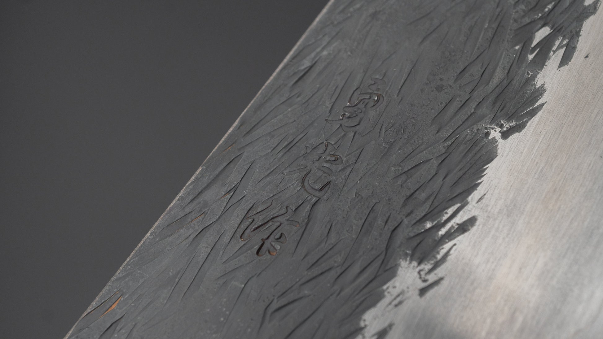 This is a carbon steel knife with a soft stainless steel cladding. Many Japanese knives are constructed with a 3-layer design known as “San Mai,” where a hard, high-quality steel core is sandwiched between two layers of softer steel or iron. In this case, the core is made of carbon steel, while the outer layers, or cladding, are composed of stainless steel. This construction combines the benefits of a carbon steel edge, such as easy sharpening and excellent edge retention, with the added corrosion resistance of stainless steel for the rest of the blade.