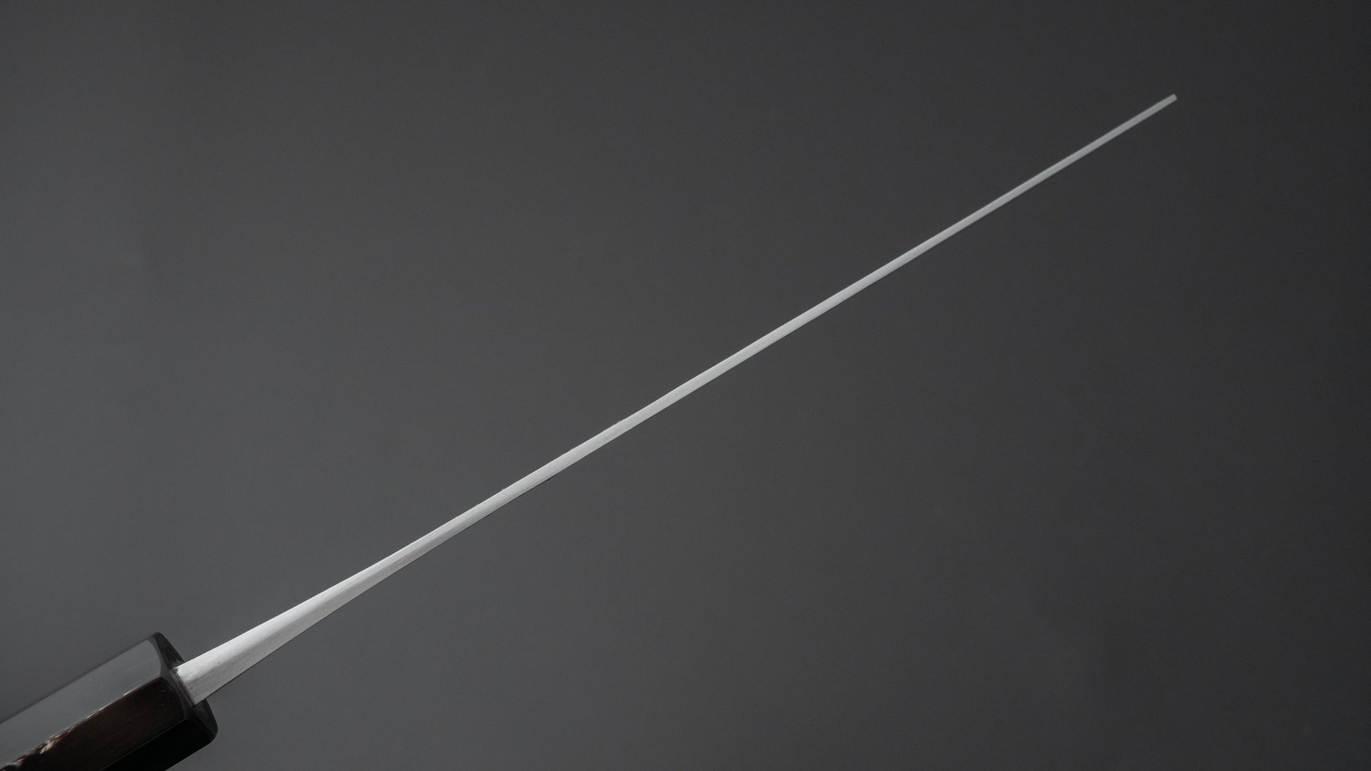 Each blade is meticulously polished and sharpened by Jiro-san using his favorite combination of synthetic and natural whetstones. The result is a perfectly even, finely polished bevel, not only beautiful but also contributing to the exceptional performance of these knives, the highest-performing we’ve ever encountered.