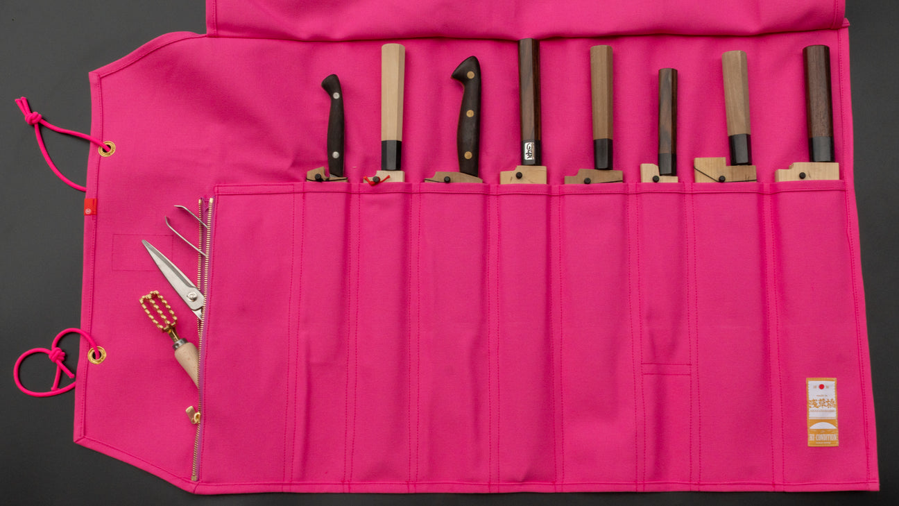 These durable and functional Hanpu canvas knife rolls are handmade by HI-CONDITION in Asakusa-bashi, Tokyo. Designed to store your knives blade-down in the sleeves, they help preserve both the appearance and edges of your knives. They comfortably accommodate knives with protectors (see picture).