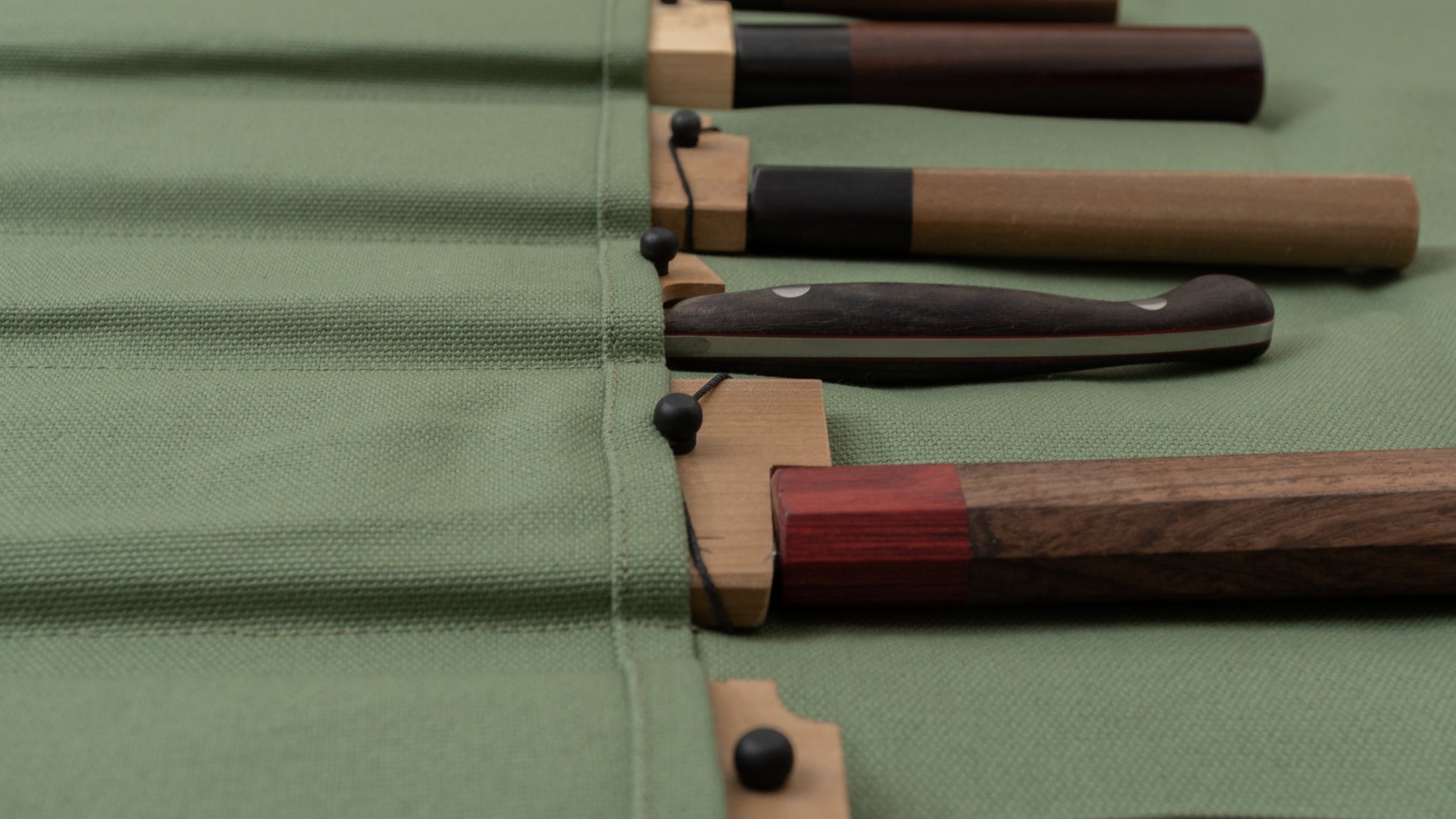 These durable and functional Hanpu canvas knife rolls are handmade by HI-CONDITION in Asakusa-bashi, Tokyo. Designed to store your knives blade-down in the sleeves, they help preserve both the appearance and edges of your knives. They comfortably accommodate knives with protectors (see picture).