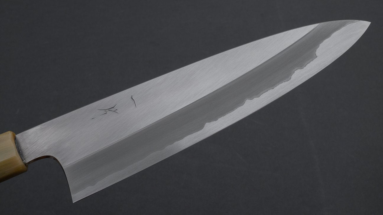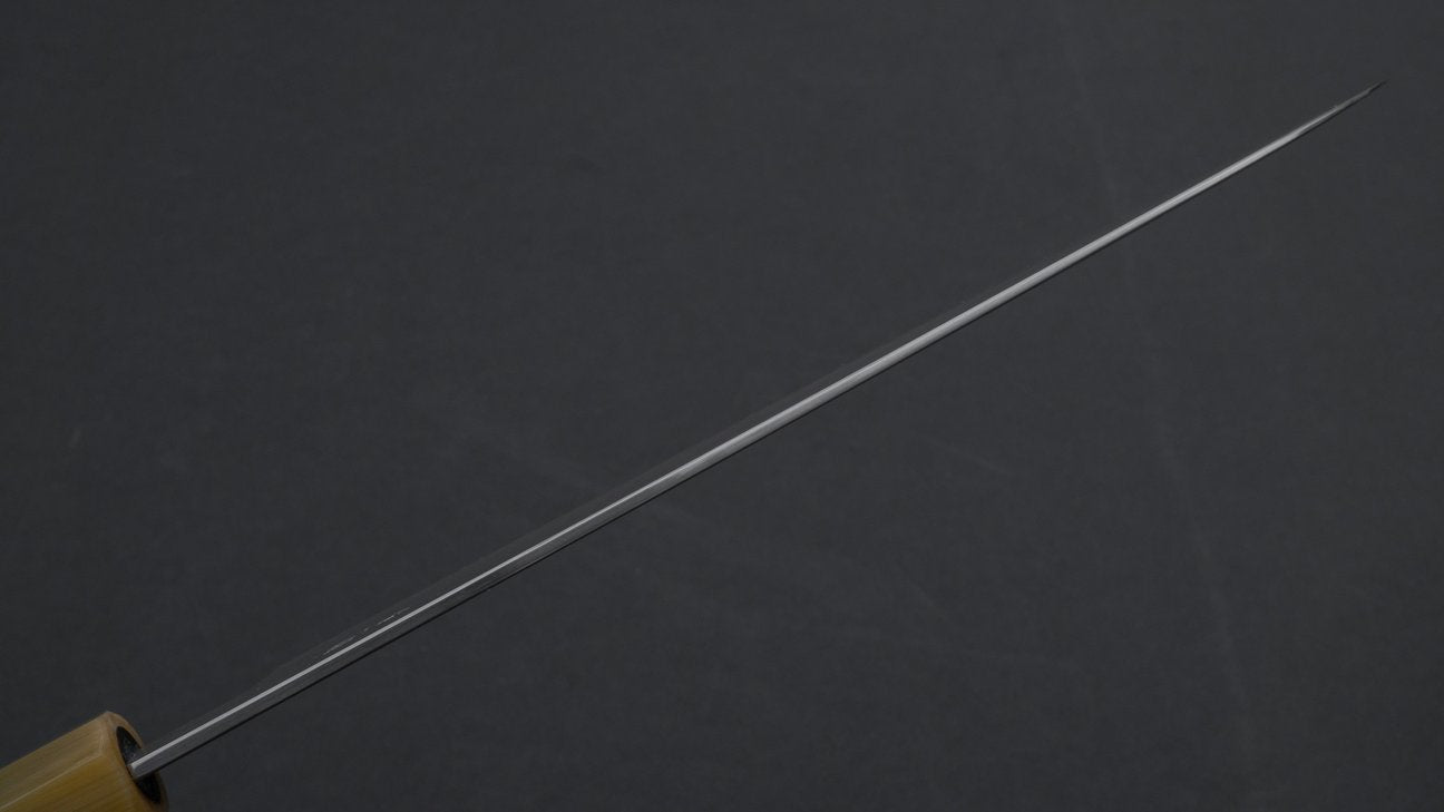 De Togashi Migaki met roestvrijstalen bekleding is een van de series van de hoogste kwaliteit die we bij Karasu aanbieden. Gemaakt van alleen Blue #1 of White #1 staal, dit kenmerkte een uniek Hitohira-profiel met een scherpe brede schuine geometrie die zeer gepolijst is. Uitstekende snijprestaties dankzij de dunne rand, maar zonder delicaat aan te voelen. De pasvorm en afwerking zijn van hoog niveau met fijne hardhouten handgrepen en kenmerkende hielpolijst.