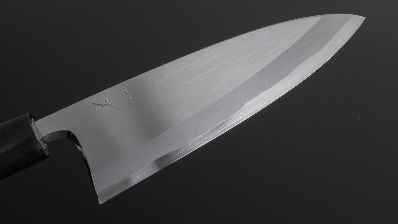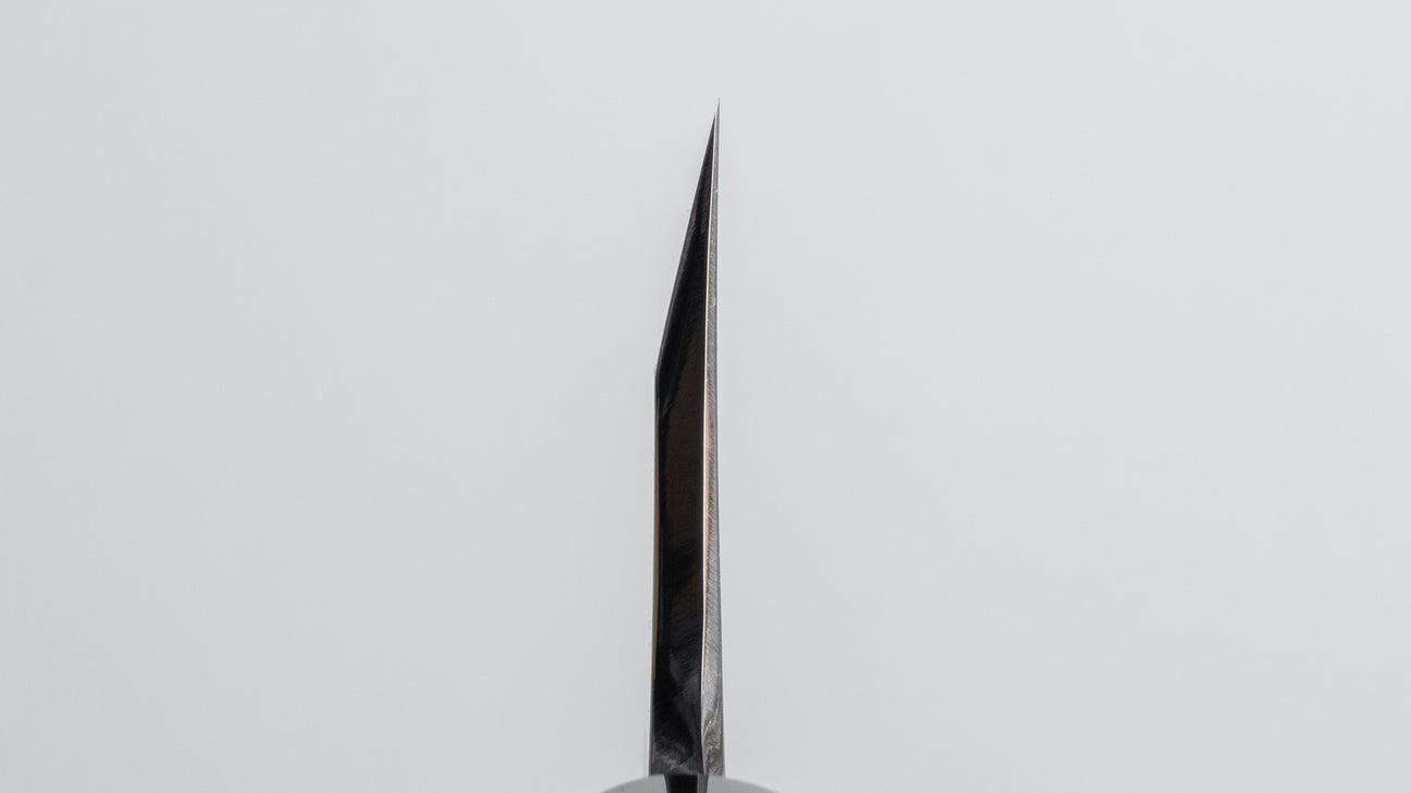 This is a carbon steel knife. Carbon steel is a non-stainless steel that lacks sufficient chromium and/or nickel to protect it from oxidation. As a result, it reacts to moisture and oxygen. While this may sound like a downside, it’s actually a key feature. Carbon steel forms a unique patina over time, is easy to sharpen, and offers excellent edge retention.