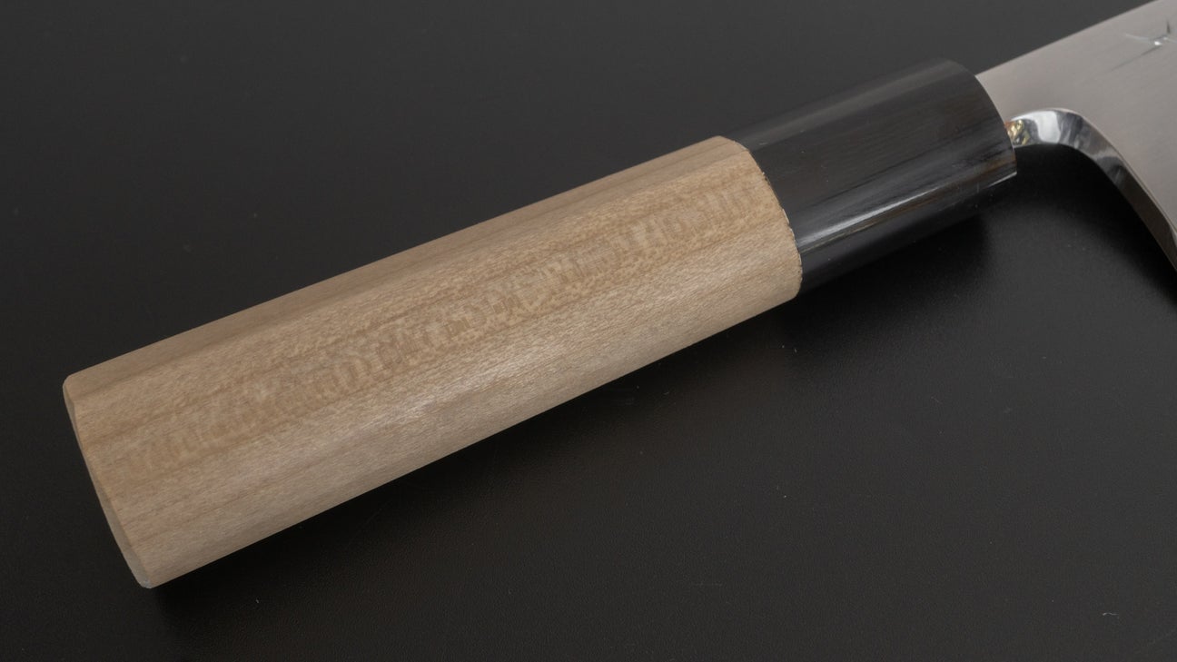 Naast hoogwaardige messen met dubbele schuine kant maakt de Togashi-familie al tientallen jaren uitzonderlijke messen met enkele schuine kant. Alle Hitohira Togashi-messen met enkele schuine kant worden gekenmerkt door, uiteraard, een geweldige staalkwaliteit, scherpe en consistente ura- en schuine slijpingen en een zeer hoge glans op de schuine kant, wat echt bijdraagt aan de snijprestaties. Ze zijn allemaal geslepen door Kenya Togashi onder hetzelfde dak, wat een zeldzaamheid is in Sakai, waar vervalsing en slijpers meestal twee verschillende bedrijven zijn. Zoals het meeste werk van deze werkplaats, behoren deze tot het hoogwaardige assortiment dat we voeren en het is altijd een traktatie om deze opmerkelijke messen met enkele schuine kant te ontvangen.