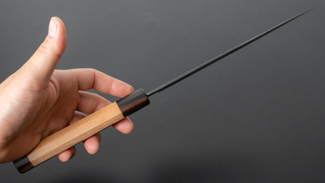 Extra: Er is geen definitief "goed of fout" tussen koolstof- en roestvrijstalen messen, maar koolstofstaal wordt vaak als superieur beschouwd voor traditionele methoden om messen te maken. Als gevolg hiervan bieden koolstofstalen messen over het algemeen een betere randbehoud, slijpvermogen en algehele prestaties vergeleken met andere in dezelfde prijsklasse.