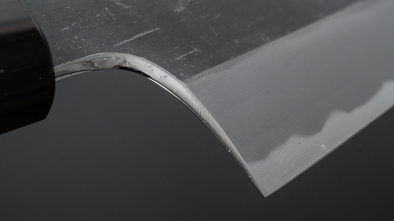 De Hitohira Togashi Kurouchi-serie is voorzien van Blue and White stalen #2-bladen. Deze worden gekenmerkt door hun rustieke kurouchi-afwerking. Dit is een natuurlijke zwarte schilfering die overblijft van het smeedproces. Wat deze serie uniek maakt, is het feit dat de smid de dikte van de rug bepaalt. Met messen die volledig gepolijst zijn, kunnen de slijpers de dikte van de rug en de tapsheid naar wens aanpassen. Hier is dit niet het geval, anders gaat de donkere afwerking verloren. Naast de esthetiek die de kurouchi toevoegt, vermindert het de oxidatie op het deel van het blad. Hoewel deze messen er rustieker uitzien en aanvoelen, zijn de prestaties ongelooflijk. De brede en fijn gepolijste schuine randen zorgen voor een soepel snijgevoel.