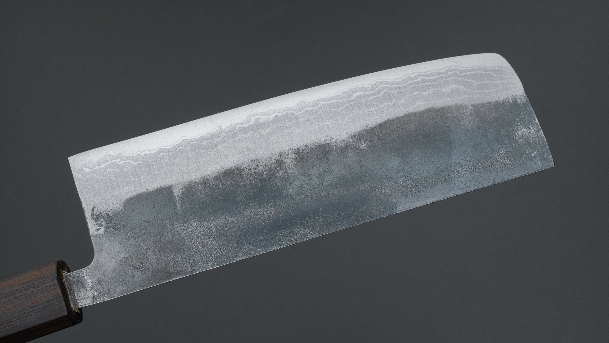 Dit is een mes van koolstofstaal. Koolstofstaal is een niet-roestvrij staal dat niet genoeg chroom en/of nikkel bevat om het te beschermen tegen oxidatie. Als gevolg daarvan reageert het op vocht en zuurstof. Hoewel dit misschien als een nadeel klinkt, is het eigenlijk een belangrijk kenmerk. Koolstofstaal vormt na verloop van tijd een unieke patina, is gemakkelijk te slijpen en biedt uitstekende randbehoud.