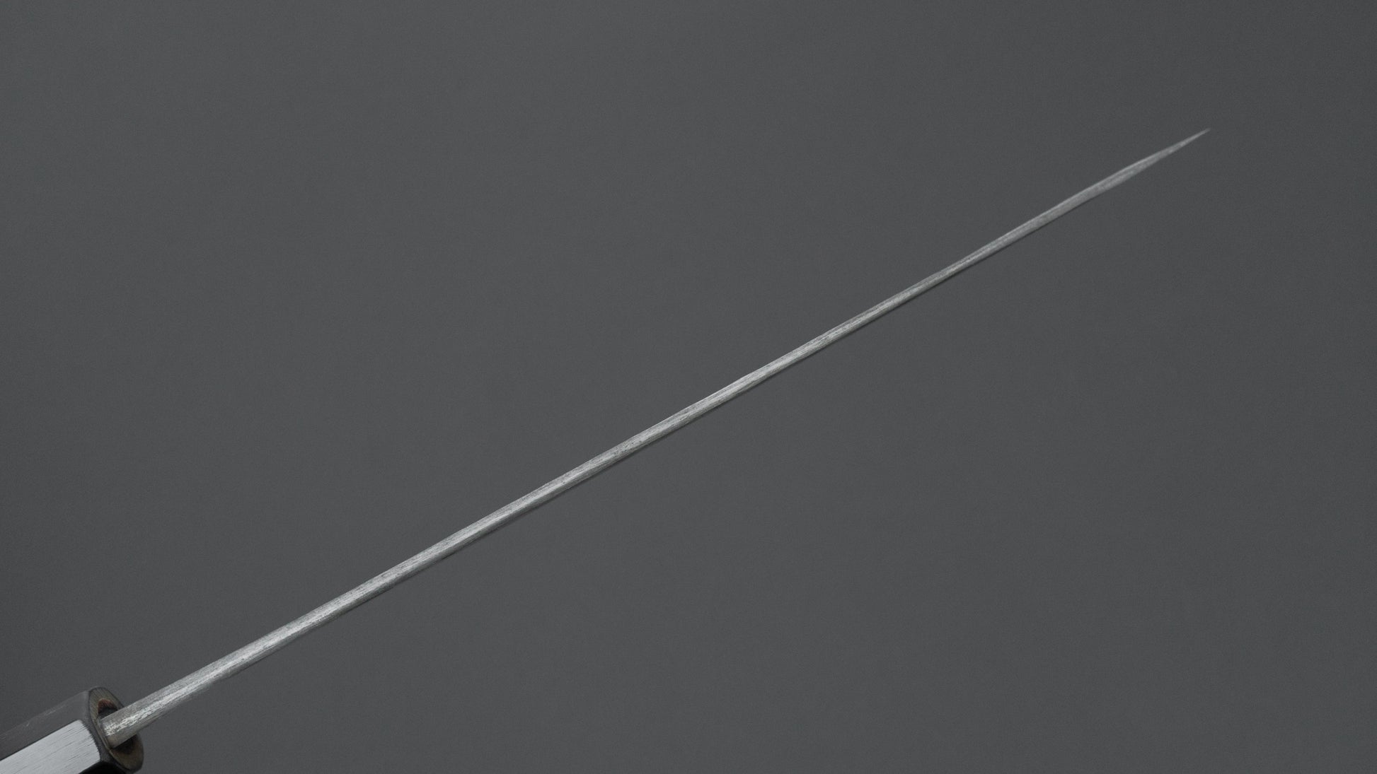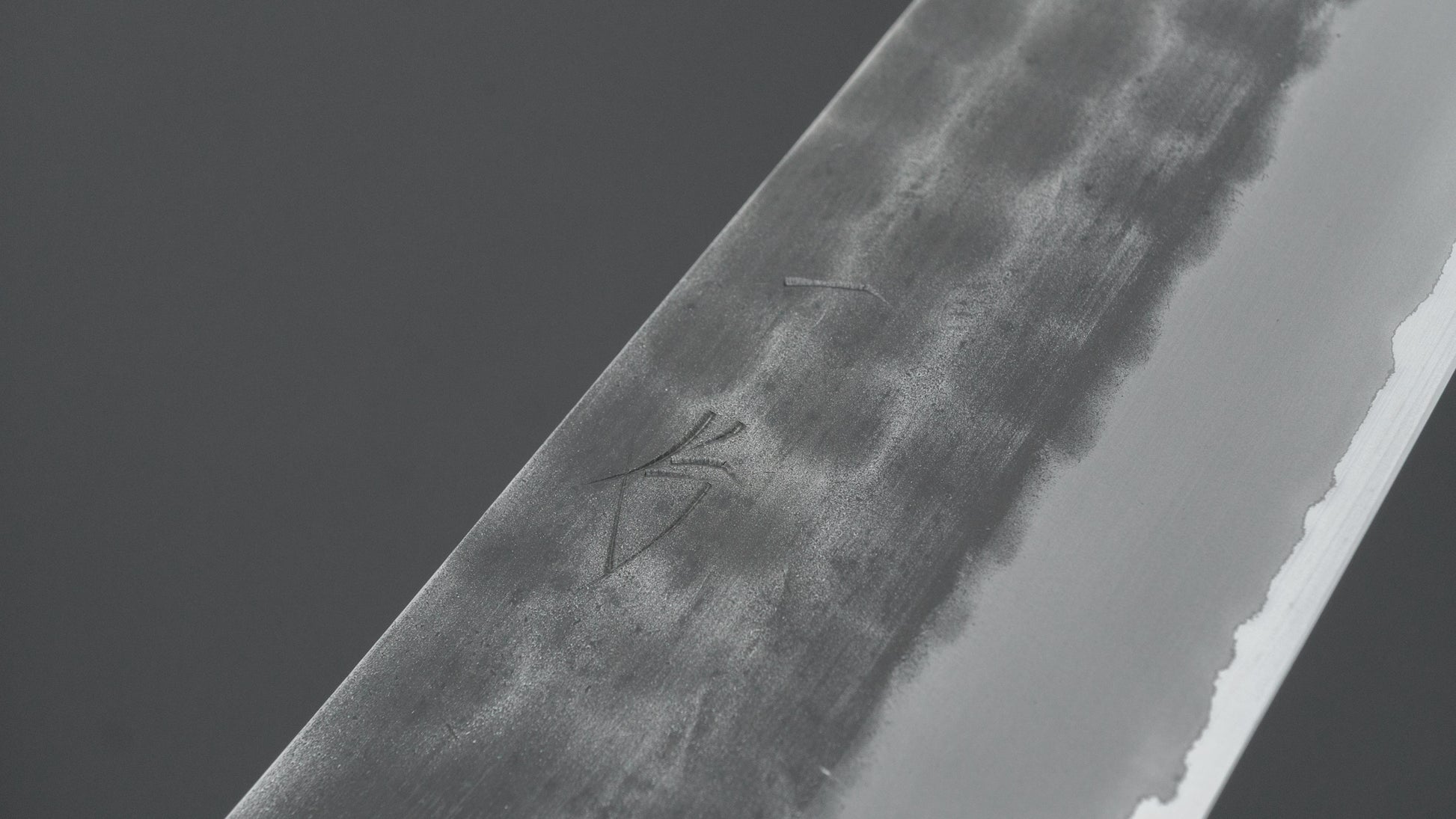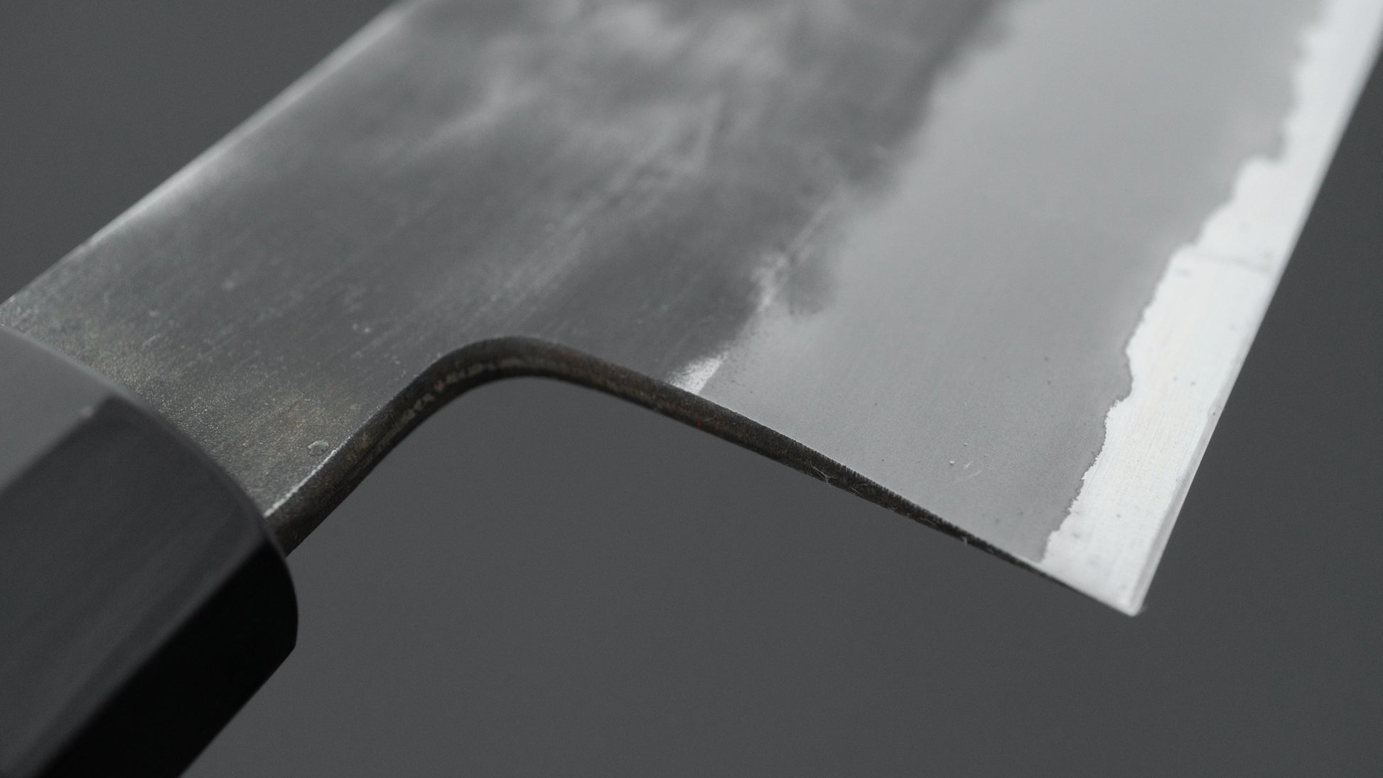 Dit is een mes van koolstofstaal met een zachte roestvrijstalen bekleding. Veel Japanse messen zijn gemaakt met een drielaags ontwerp, bekend als "San Mai", waarbij een harde, hoogwaardige stalen kern tussen twee lagen zachter staal is geplaatst. In dit geval is de kern gemaakt van koolstofstaal, terwijl de buitenste lagen, of bekleding, van roestvrij staal zijn. Deze constructie combineert de voordelen van een snede van koolstofstaal – zoals gemakkelijk slijpen en een uitstekende scherptebehoud – met de extra corrosiebestendigheid van roestvrij staal voor de rest van het lemmet.