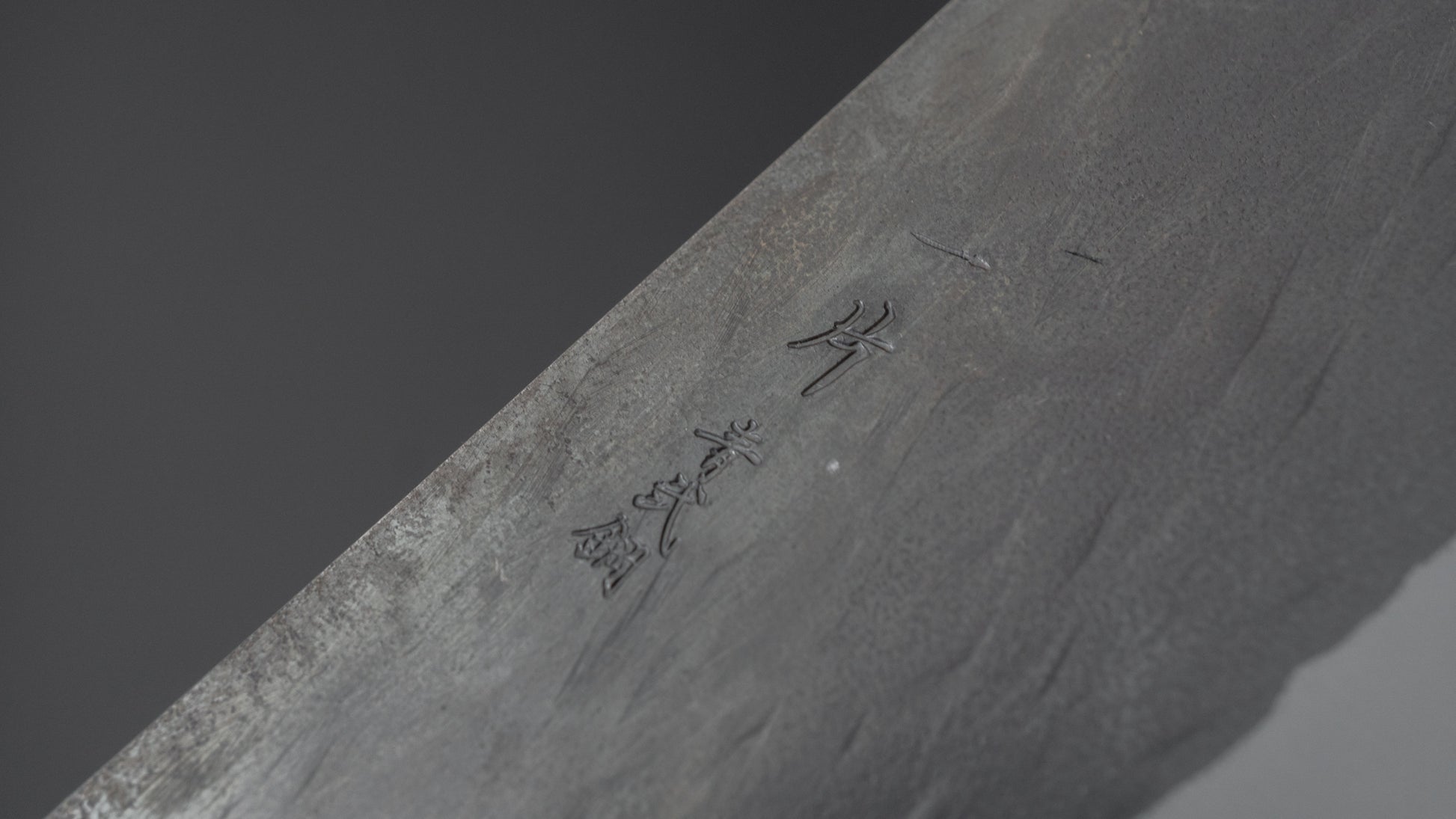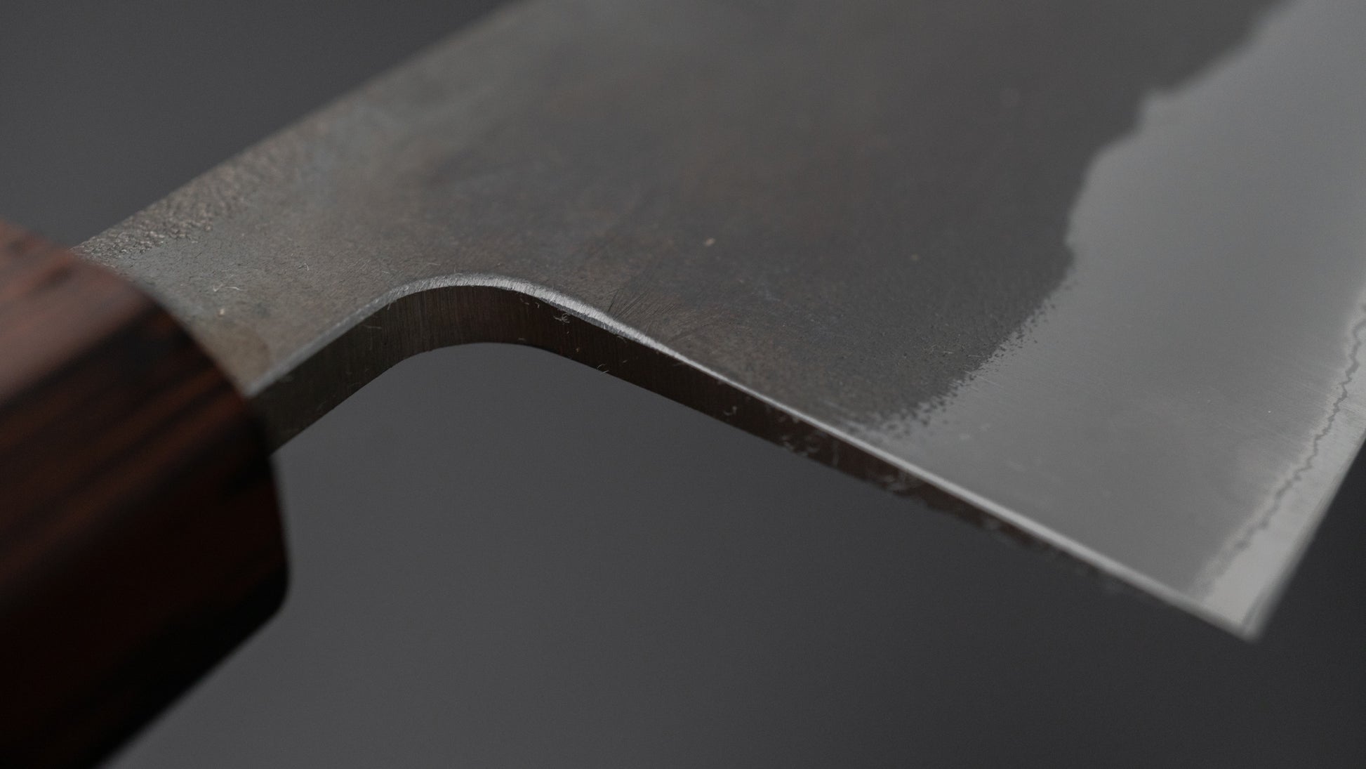 Dit is een mes van koolstofstaal met een zachte roestvrijstalen bekleding. Veel Japanse messen zijn gemaakt met een 3-laags ontwerp dat bekend staat als "San Mai", waarbij een harde, hoogwaardige stalen kern tussen twee lagen zachter staal is geklemd. In dit geval is de kern gemaakt van koolstofstaal, terwijl de buitenste lagen, of bekleding, zijn samengesteld uit roestvrij staal. Deze constructie combineert de voordelen van een koolstofstalen rand, zoals eenvoudig slijpen en uitstekende randbehoud, met de extra corrosiebestendigheid van roestvrij staal voor de rest van het lemmet.