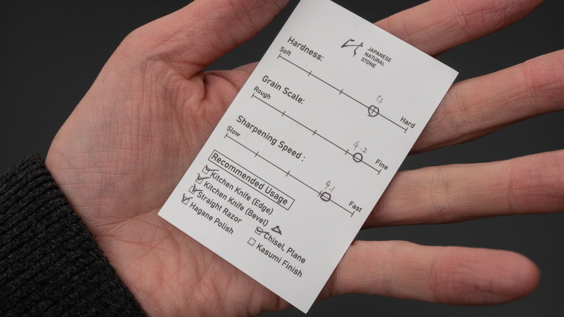 Aanbevolen gebruik: Keukenmes (rand), Keukenmes (schuin), Beitel, Schaaf, Hagane-polijstmiddel, Open scheermes, Kasumi-afwerking