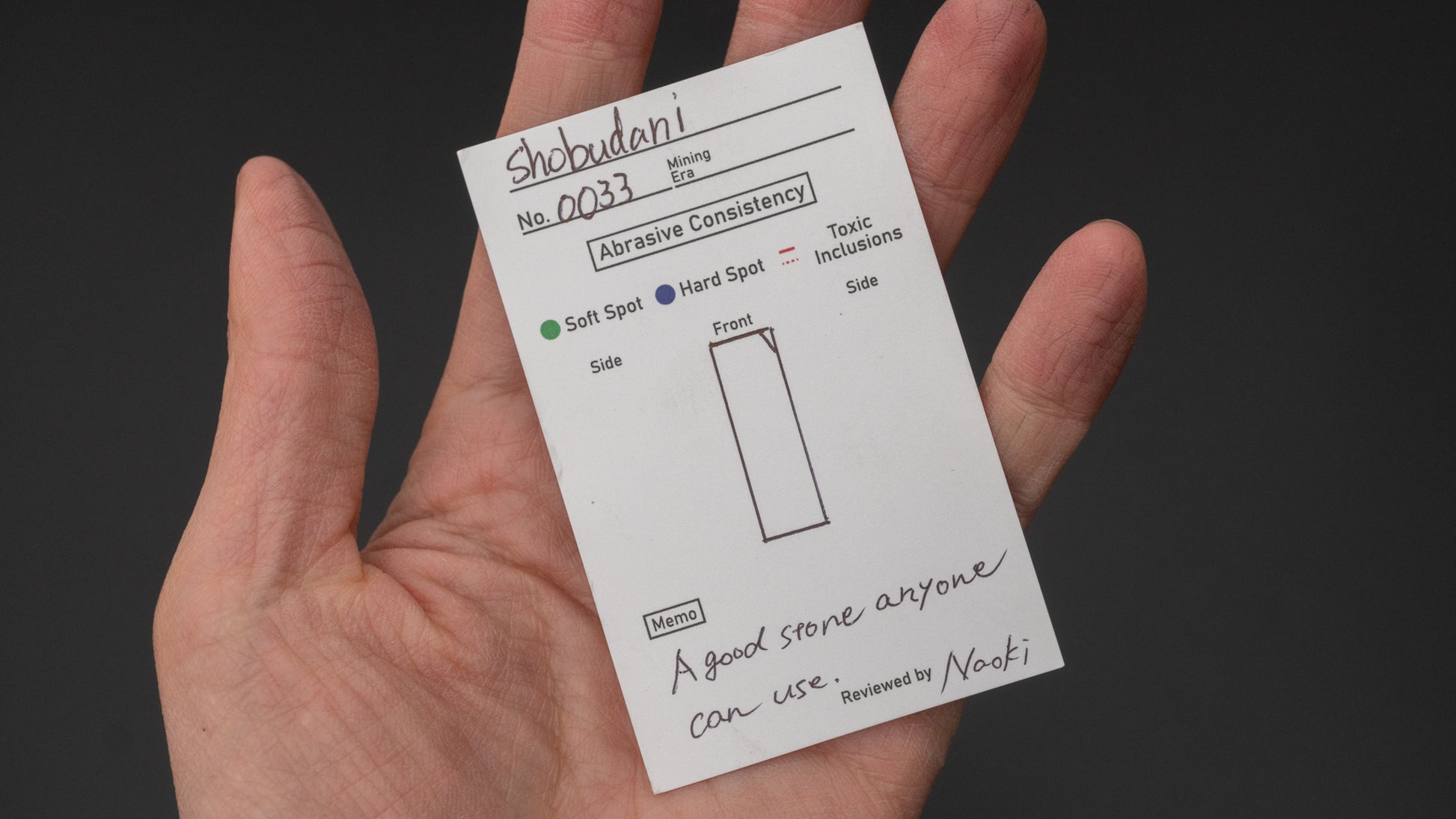 Een allround Shuboudani, goed formaat, goede statistieken en goede prijs. Gebruiksvriendelijk. Het is aan te raden om deze steen te verzegelen of vast te zetten. Klassieke shobu-afwerking met goed contrast, maar meer aan de glanzende kant.