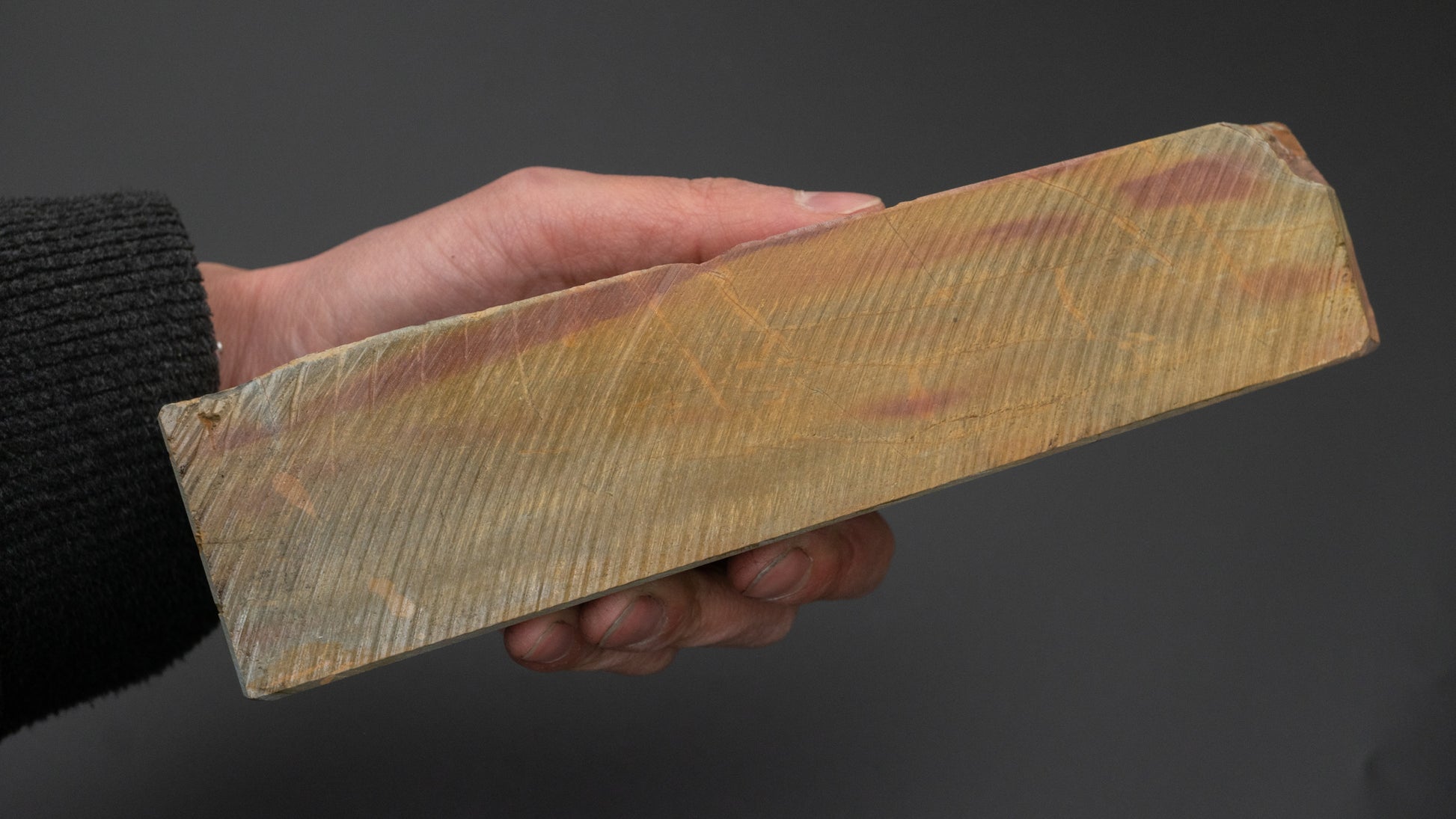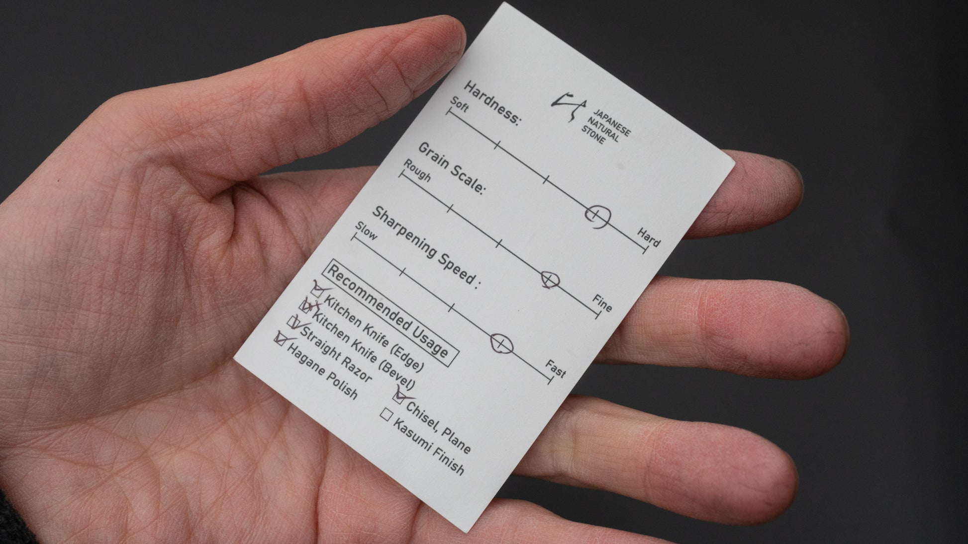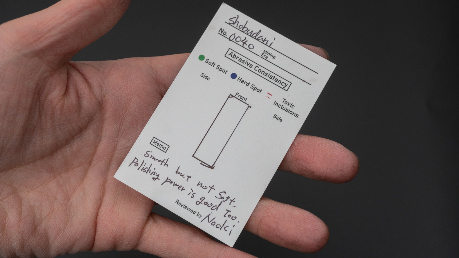 Een off-size maar goed geprijsde en schone Aka Shobudani, erg glad met een agressief snijgevoel, erg goede polijstkracht en met een erg fijne, wazige en gedetailleerde glans op de finish. Perfect voor mesranden maar vooral voor kleinere gereedschappen zoals kiridashi en beitels.