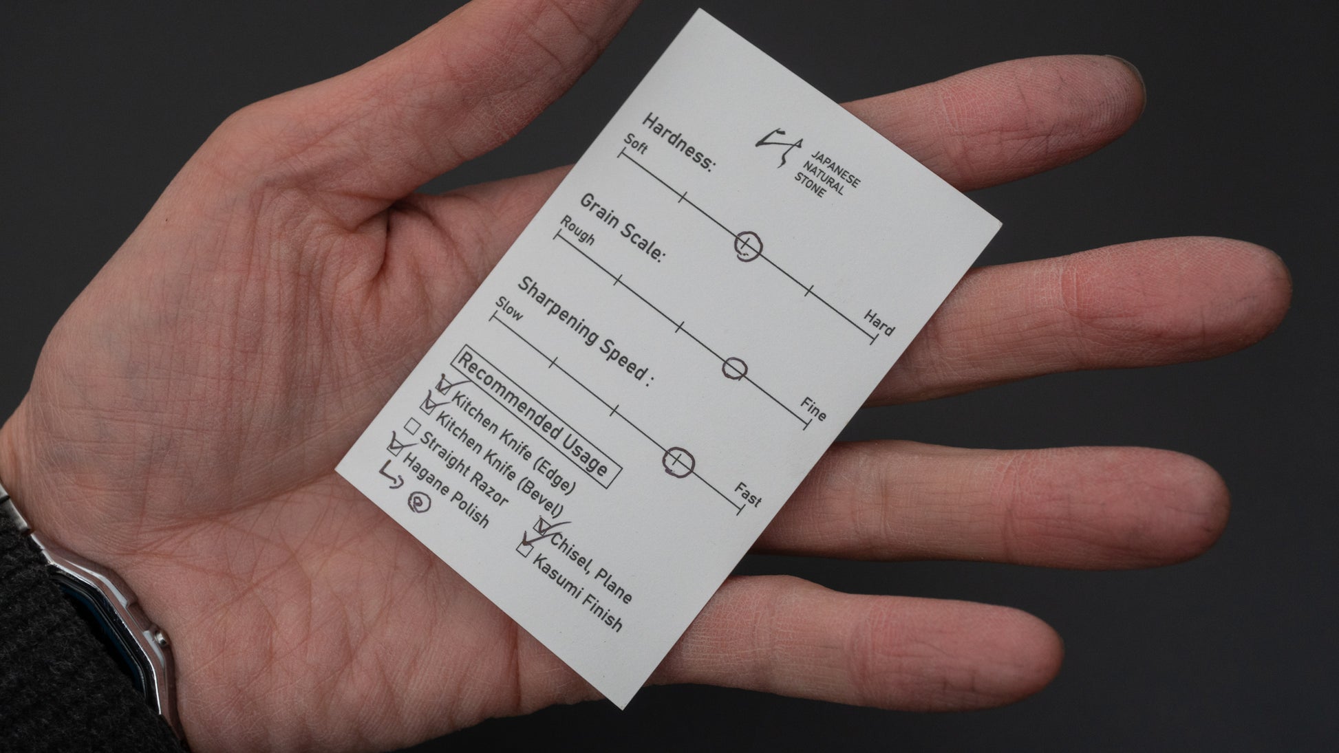 Aanbevolen gebruik: Keukenmes (rand), Keukenmes (schuin), Beitel, Schaaf, Hagane Polish, Kasumi Finish