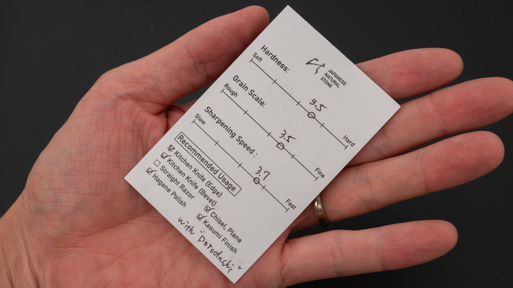 Hitohira Picked natuursteen is een zorgvuldig geselecteerde en betrouwbare slijpsteen. Het team van Hitohira werkt rechtstreeks samen met betrouwbare leveranciers om een breed scala aan hoogwaardige natuursteen te verkrijgen. Elke steen wordt individueel beoordeeld en gegradeerd door onze expert, Naoki Tsuda, wiens diepgaande kennis zorgt voor consistente resultaten. Elke steen wordt geleverd met een kaartje met een duidelijke en eerlijke beschrijving van de kwaliteiten en kenmerken.