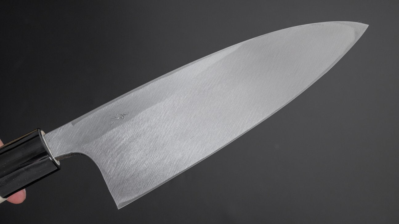 This is a carbon steel knife. Carbon steel is a non-stainless steel that lacks sufficient chromium and/or nickel to protect it from oxidation. As a result, it reacts to moisture and oxygen. While this may sound like a downside, it’s actually a key feature. Carbon steel forms a unique patina over time, is easy to sharpen, and offers excellent edge retention.