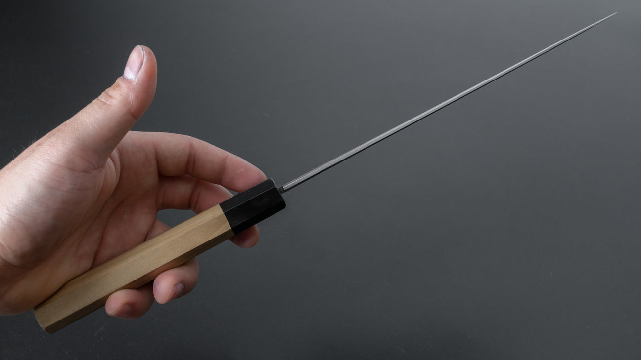 The gyuto is a true all-rounder and suitable for a wide variety of cutting tasks. A go-to knife for many and an ideal shape to start out with. Based on the Western style chef’s knife, the gyuto has a decent length, enough height to clear the knuckles from the cutting board and a somewhat narrow tip. It’s just as good at chopping an onion or cabbage, as slicing a roast or portioning fish. There's no shame in owning multiple gyuto's